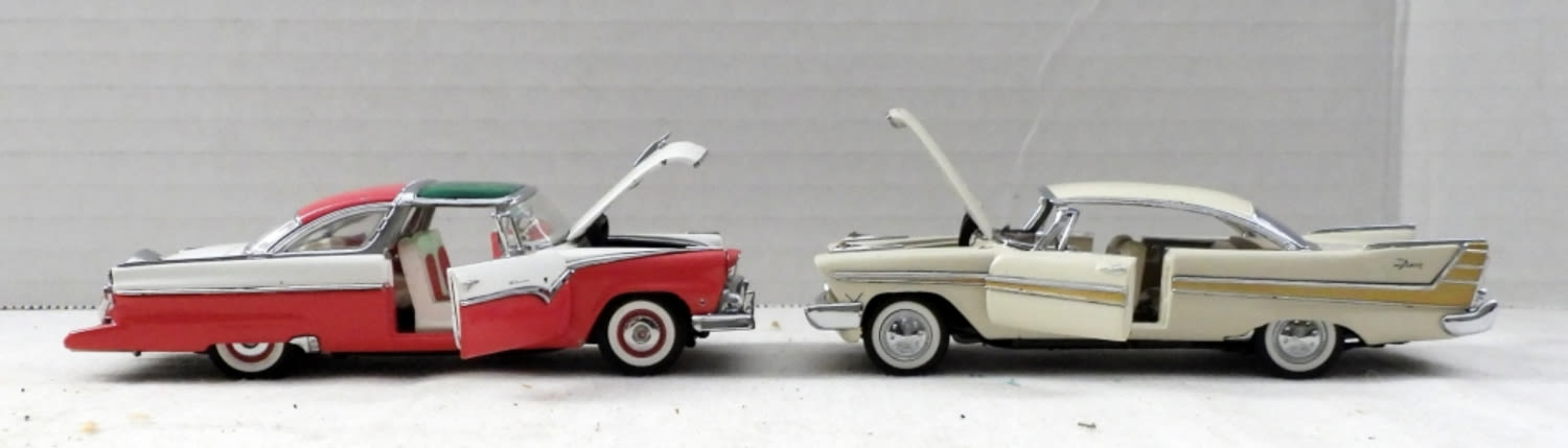 DIECAST 1957 PLYMOUTH FURY 1:24 SCALE; 1955 FORD CROWN FAIRLANE VICTORIA 1:24 SCALE PINK & WHITE; EXCELLENT CONDITION