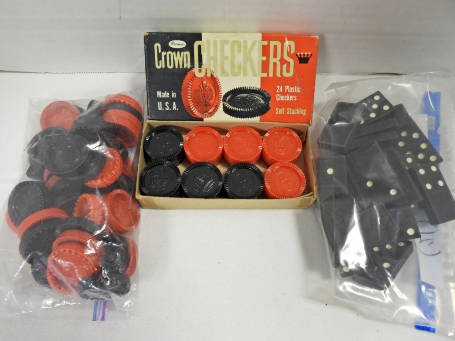 24 CHECKERS in BOX plus BAG of EXTRAS plus (21) VTG DOMINOES