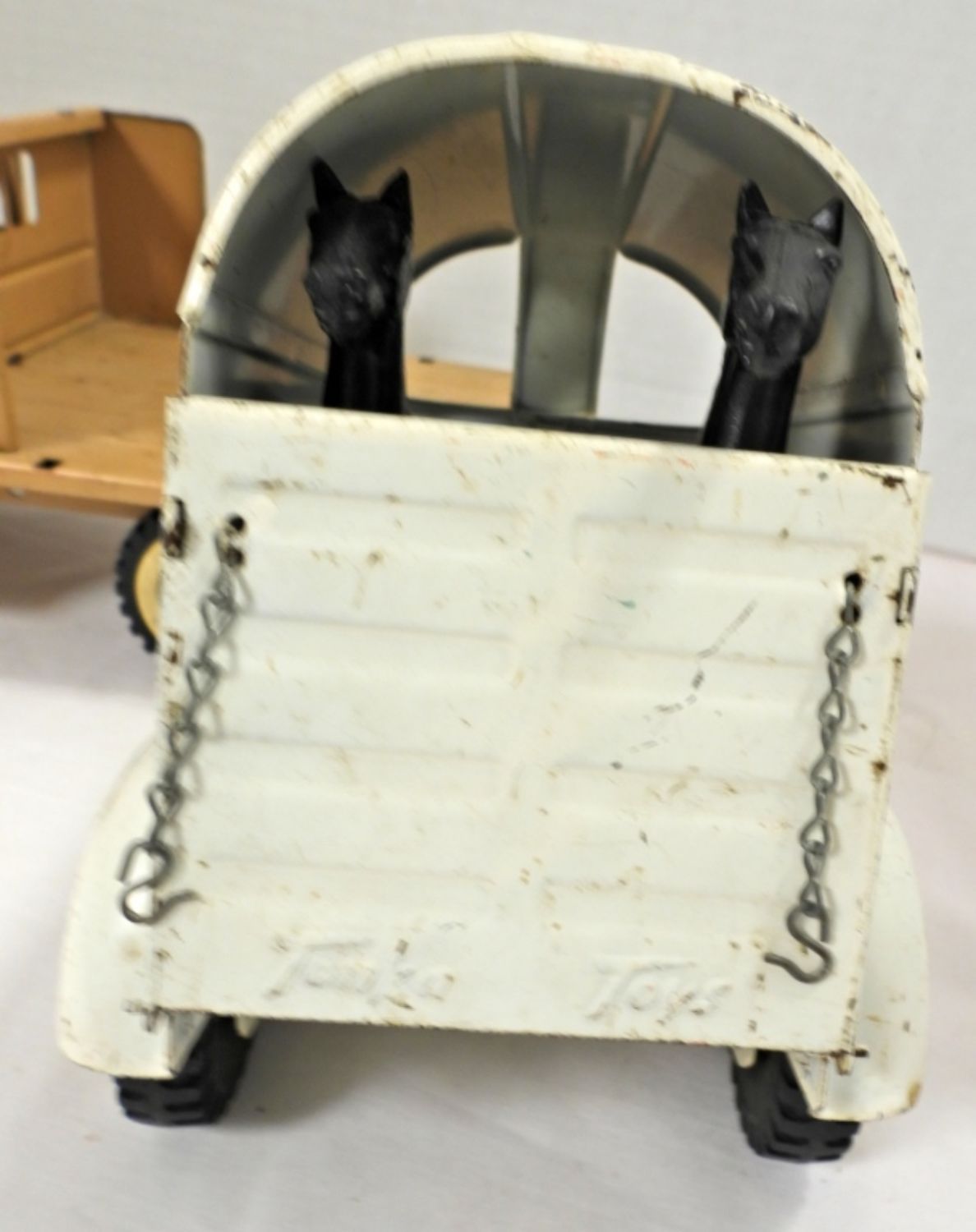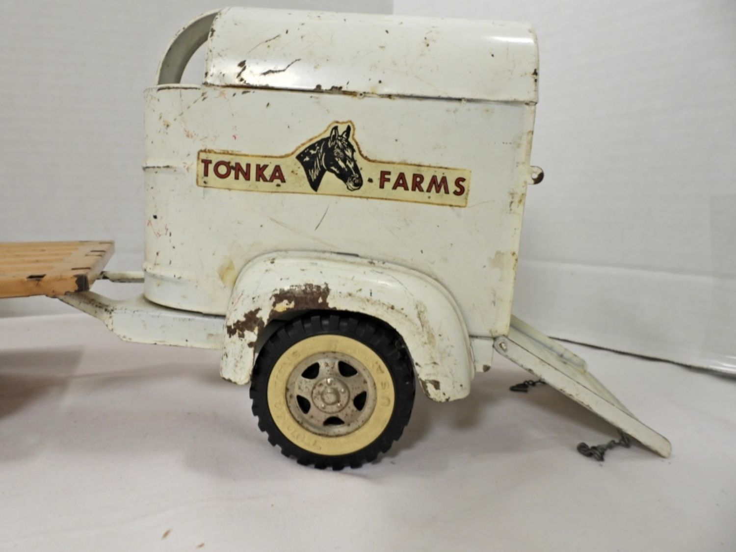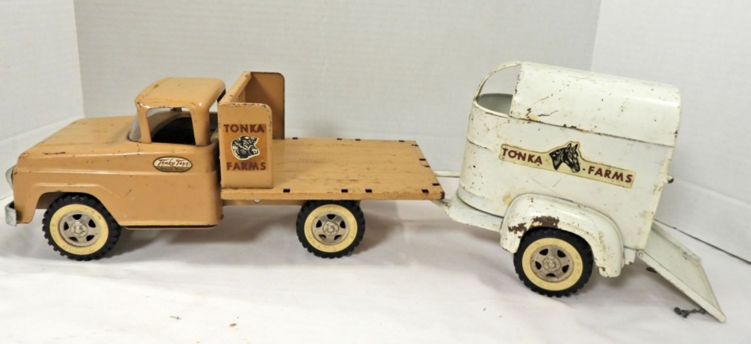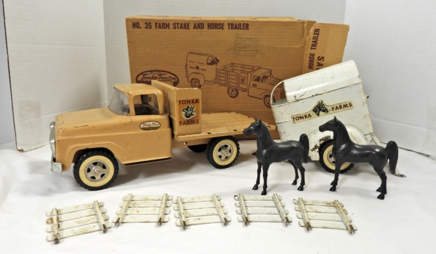 THE TRUCK MISSING ONE RAIL, WORN OVER THE YEARS, THE TAILGATE OPENS AND CLOSES WITH A CHAIN TO LOCK, 22″ LONG, COMES WITH TWO HORSES, COMES WITH BOX