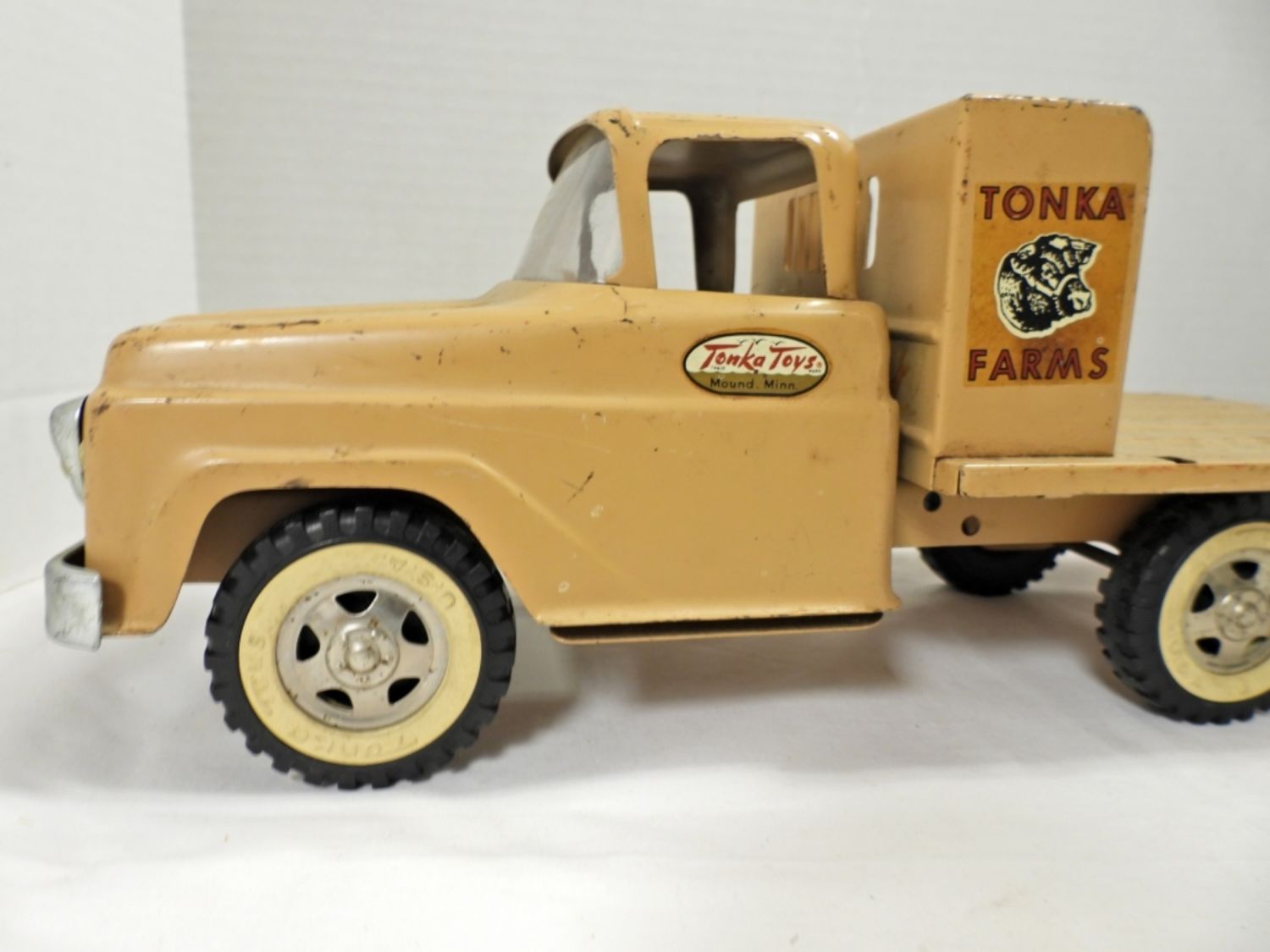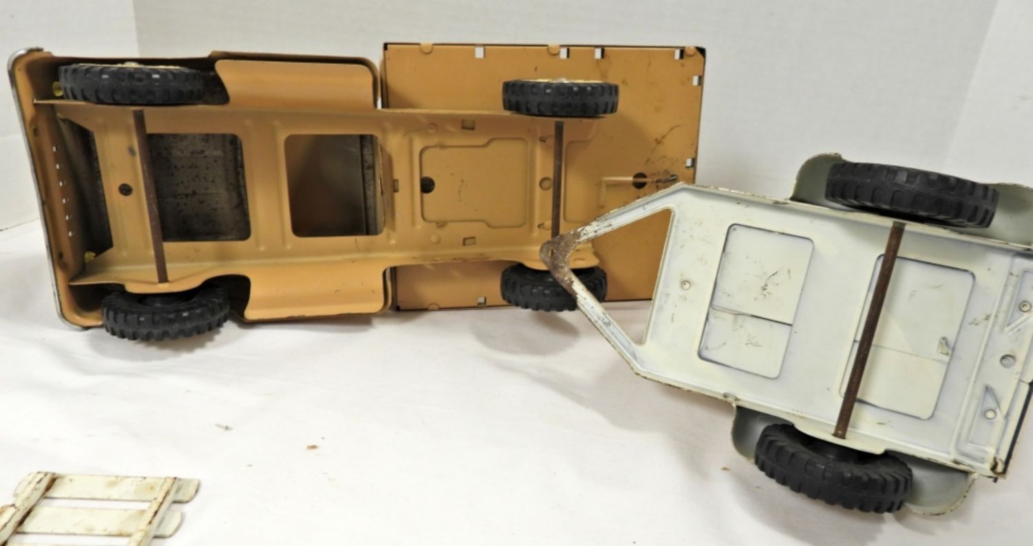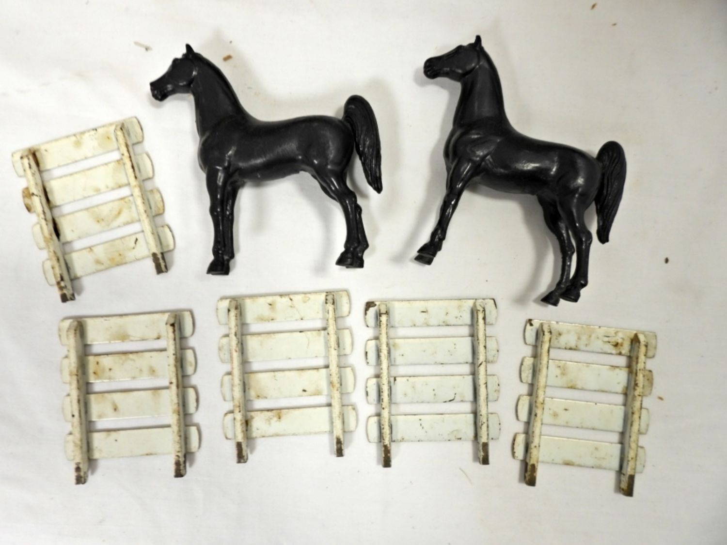 THE TRUCK MISSING ONE RAIL, WORN OVER THE YEARS, THE TAILGATE OPENS AND CLOSES WITH A CHAIN TO LOCK, 22″ LONG, COMES WITH TWO HORSES, COMES WITH BOX
