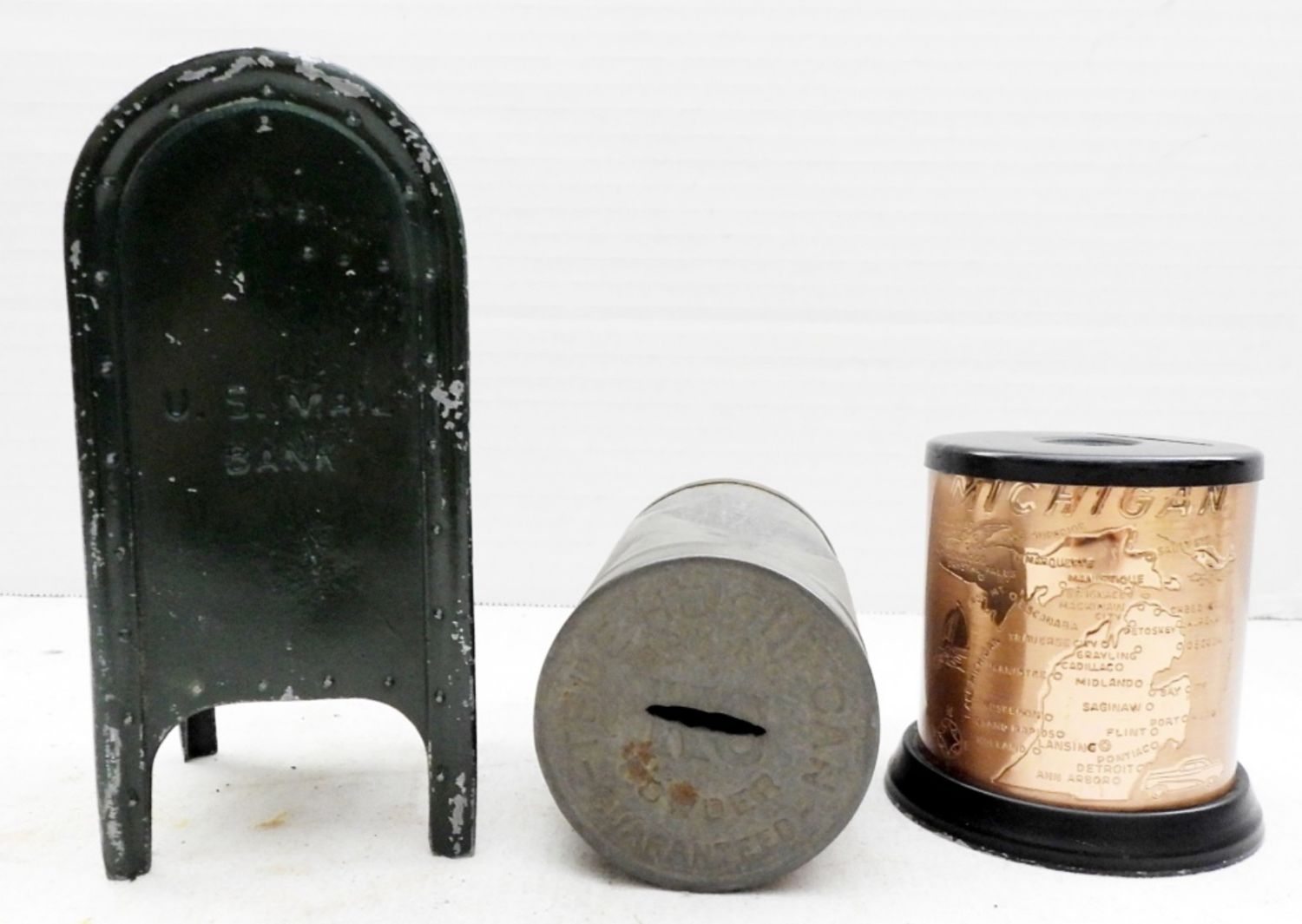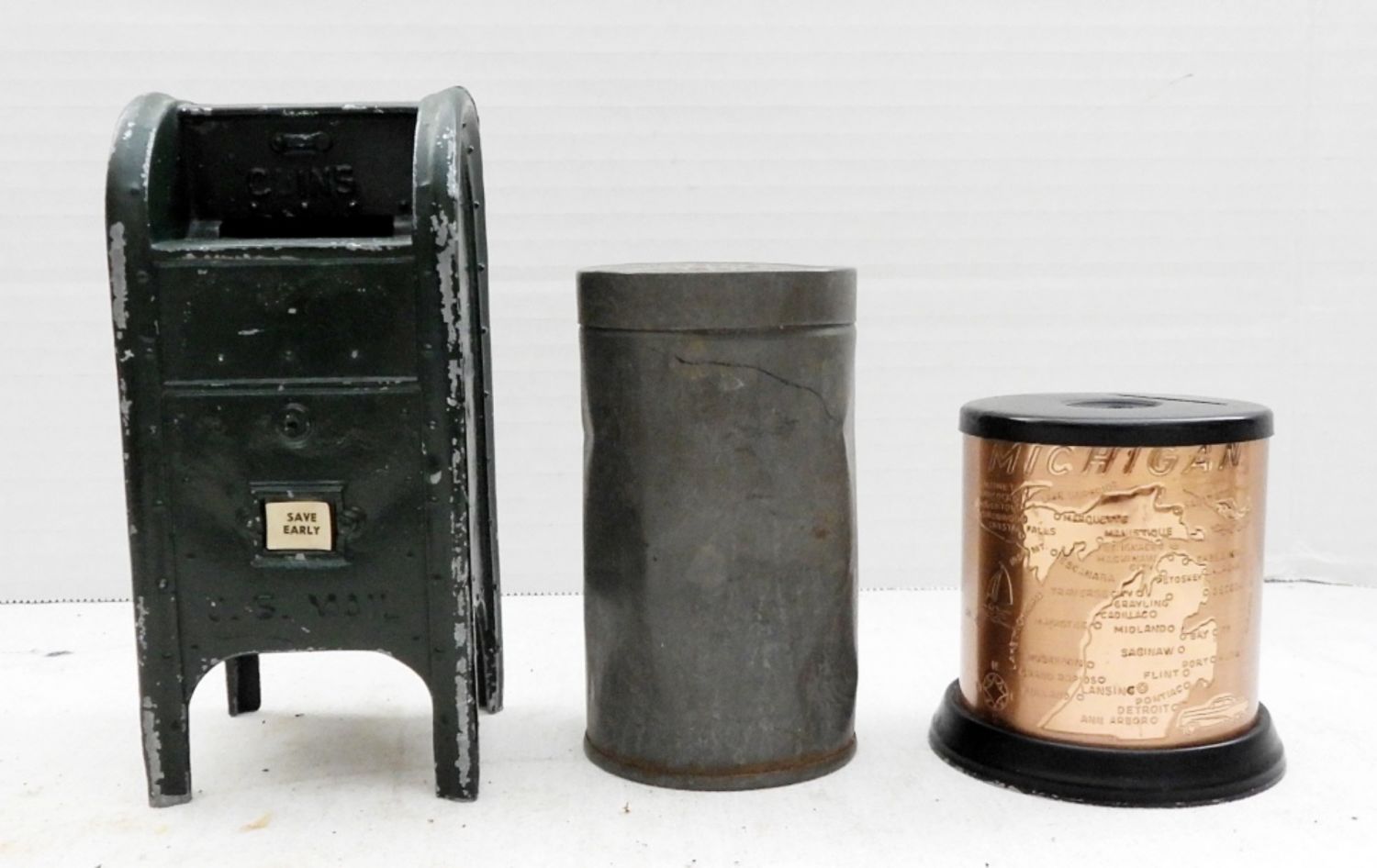 Cast Iron US Mail Box, Antique Baking Powder Tin, Michighan Metal Copper Savings Bank.