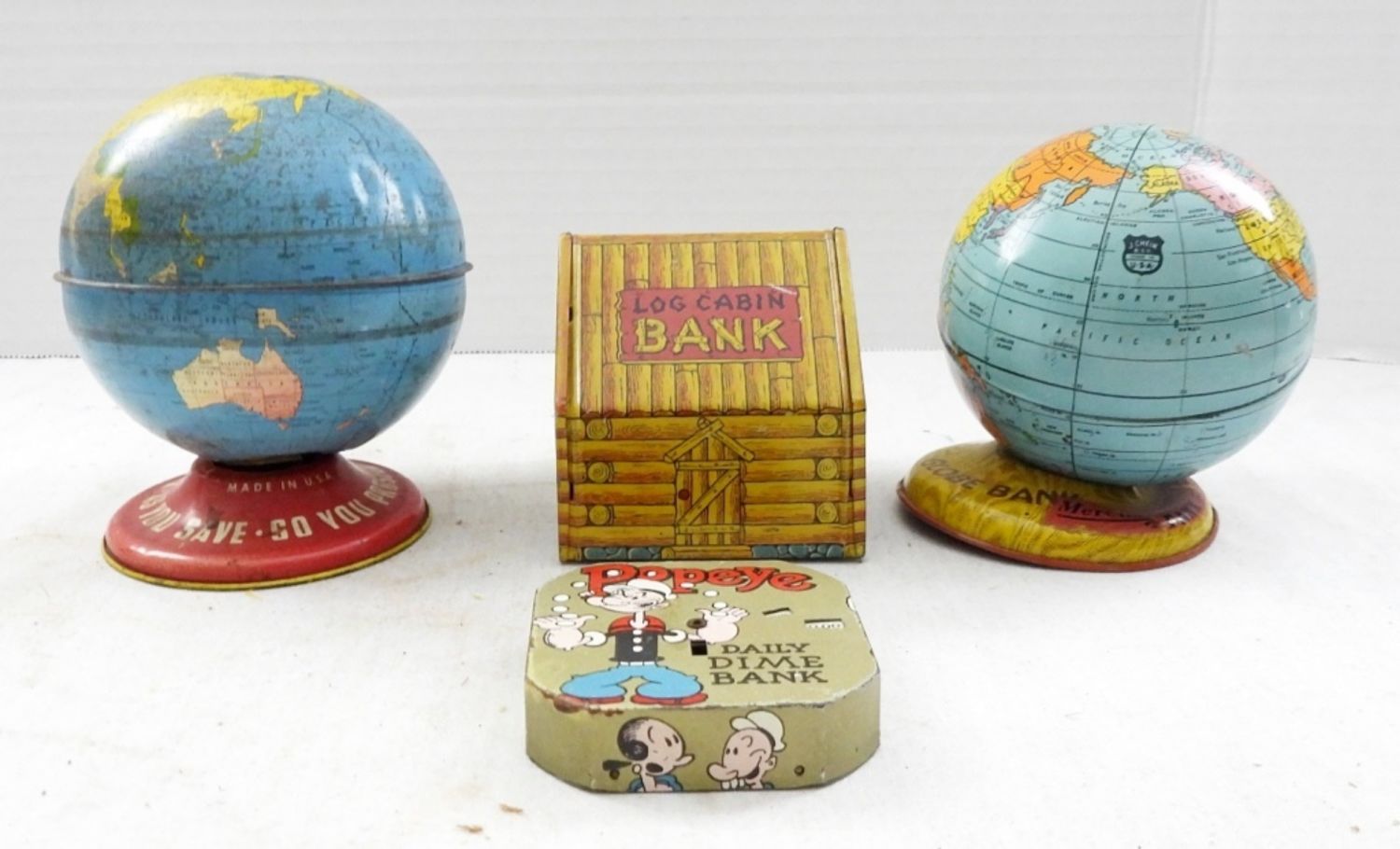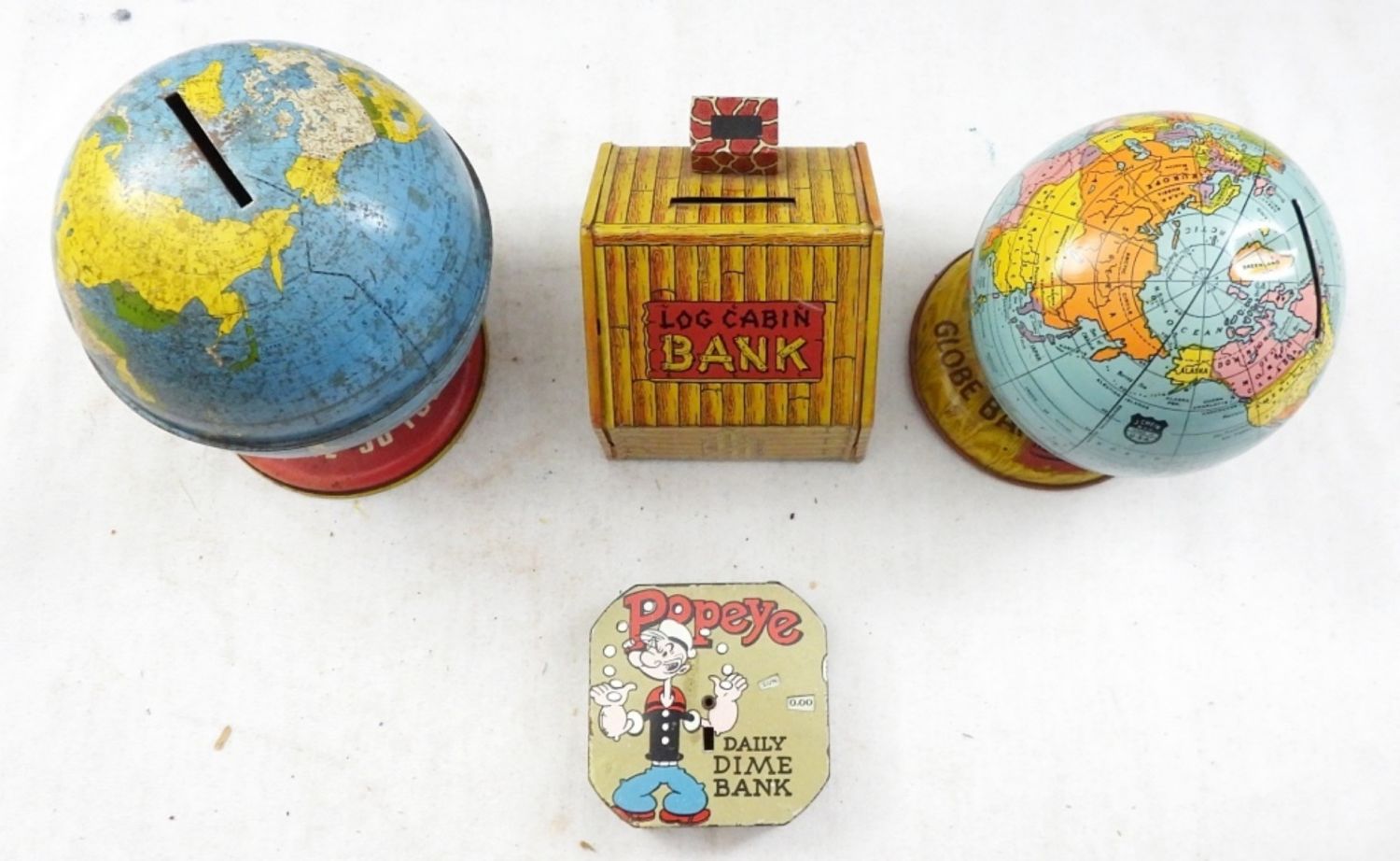 J. Chein Log Cabin, 1956 Popeye Daily Dime Bank, 1930’s J. Chein & Co. Tin Toy Globe, 1950’s Ohio Art Company Tin World Globe.
