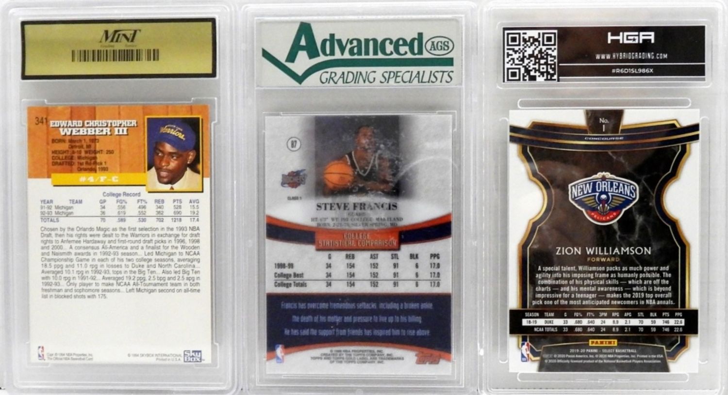 CHRIS WEBBER 1993 HOOPS #341 10 GEM MINT; STEVE FRANCIS 1999-00 TOPPS GOLD LABEL #87 10 GEM MINT; ZION WILLIAMSON 2019-20 #1 9 MINT