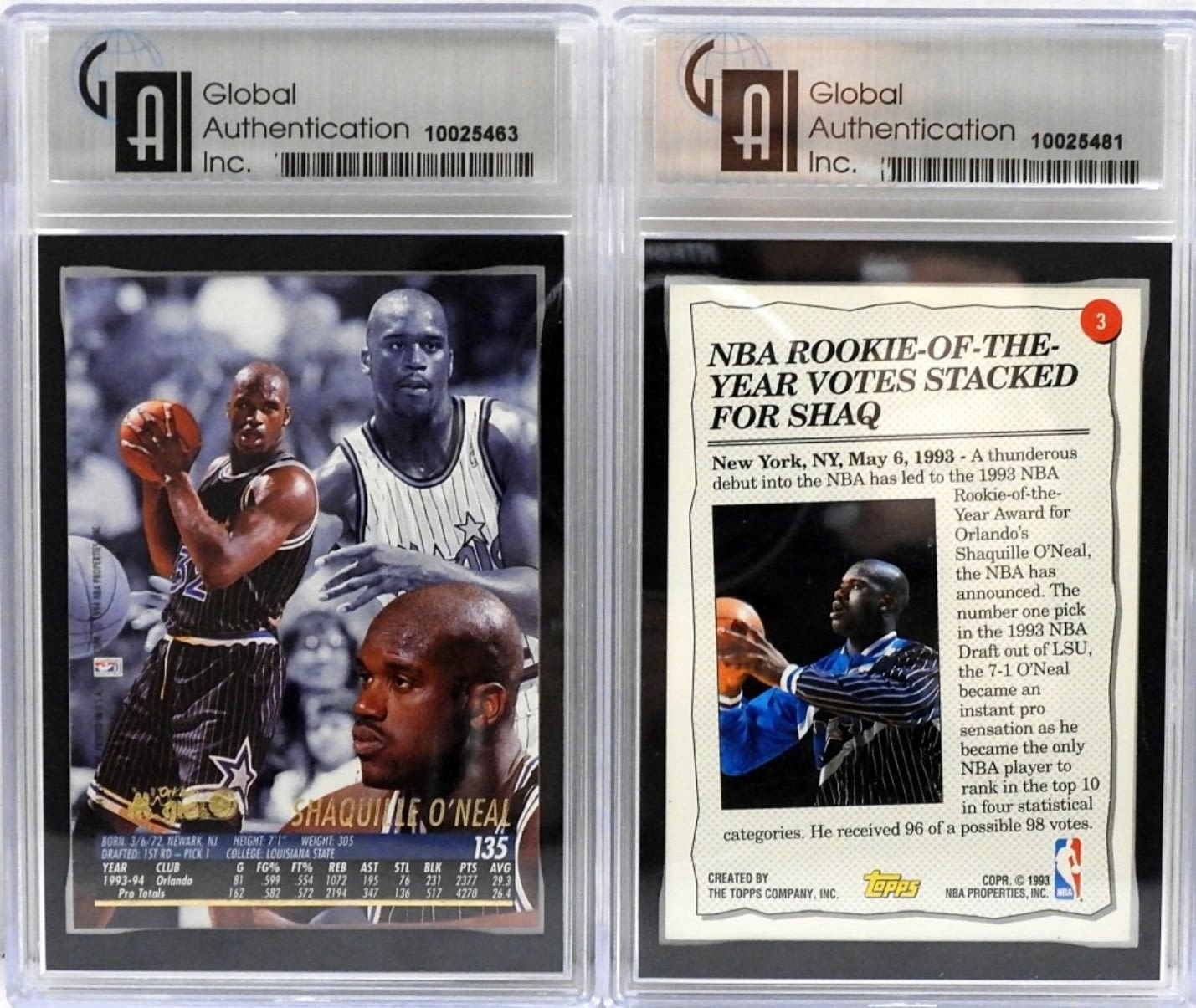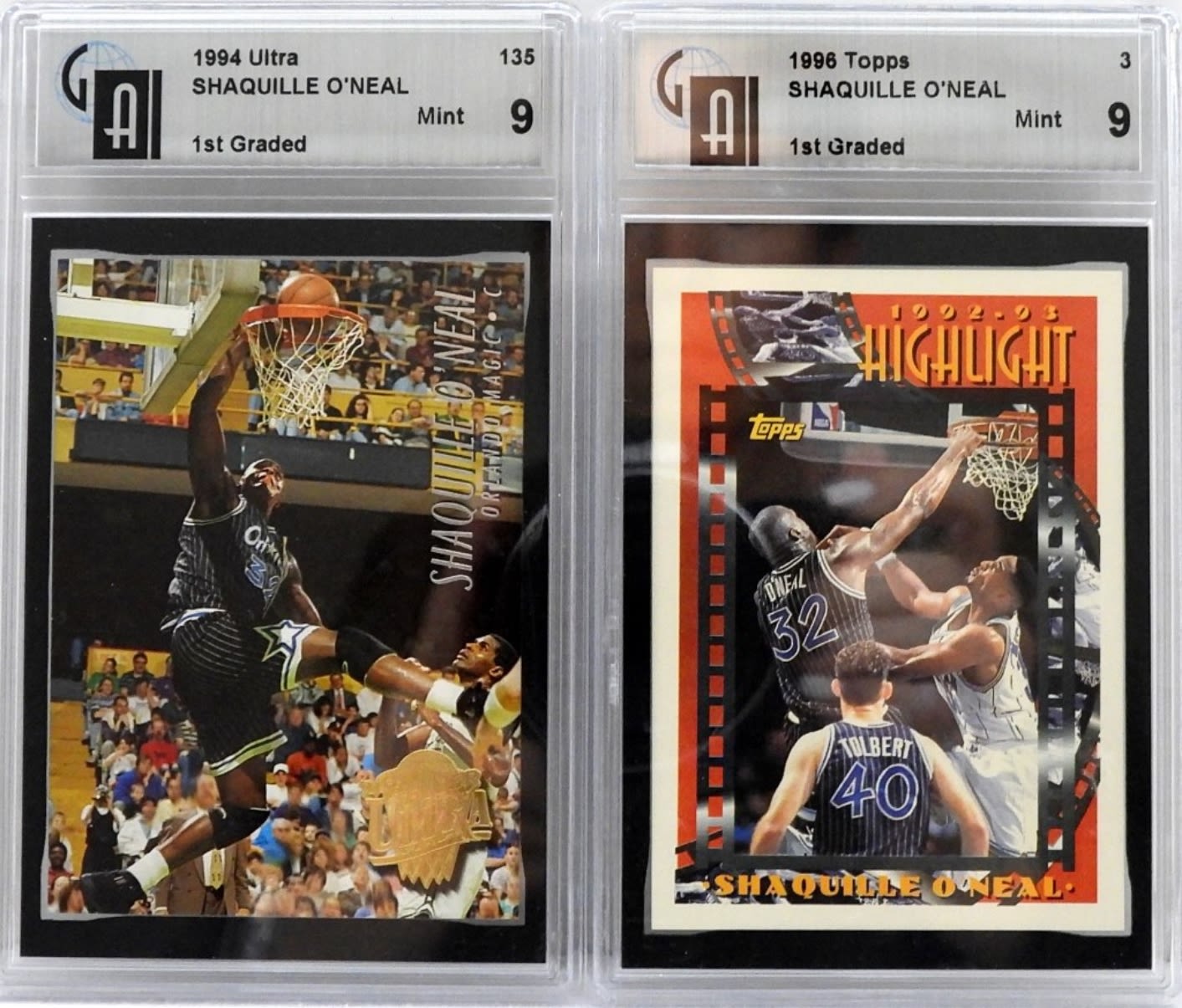 SHAQUILLE O’NEAL 1994 ULTRA #135 – 9 MINT, 1996 TOPPS #3 – 9 MINT – 1st GRADED – GLOBAL AUTHENTICATION