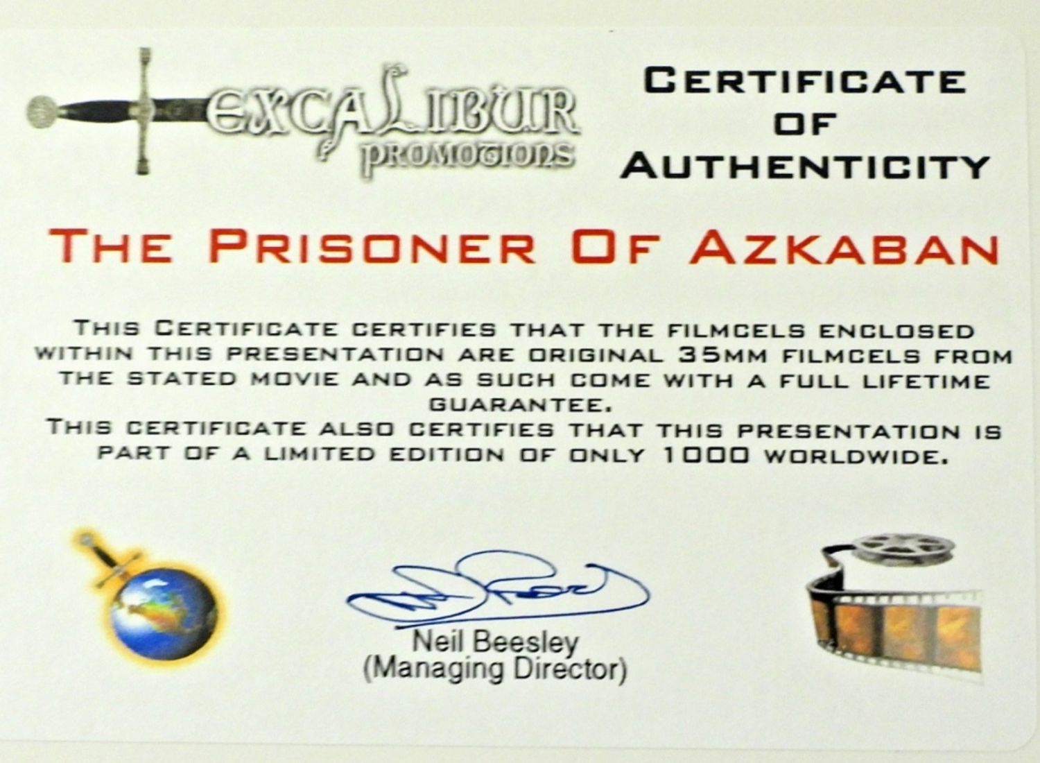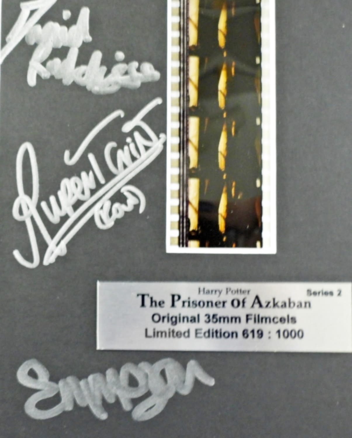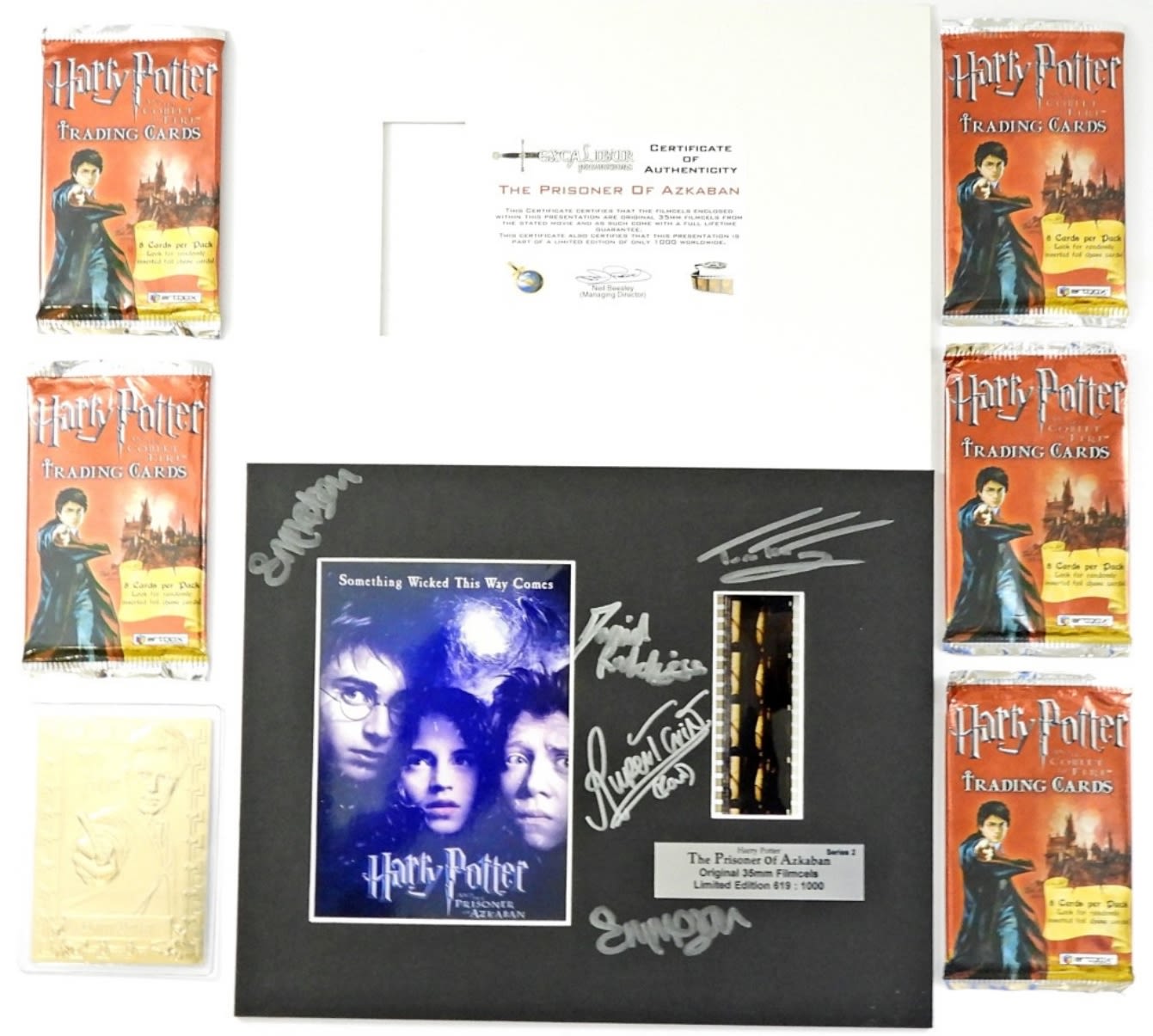 The PRISONER of AZKABAN Original 35MM Filmcels Lmt Ed 619:1000 with Filmcel COA & AUTOGRAPHED by DANIEL RADCLIFFE, RUPERT GRINT, TOM FELTON & EMMA WATSON (2x) – NO COA for AUTOGRAPHS plus HARRY POTTER GOLD FOIL CARD & (5) TRADING CARD WAX PACKS