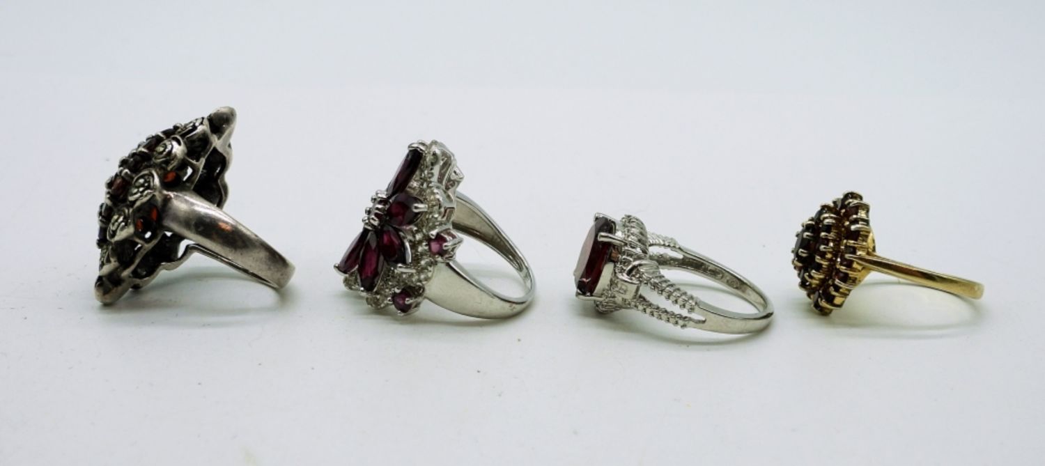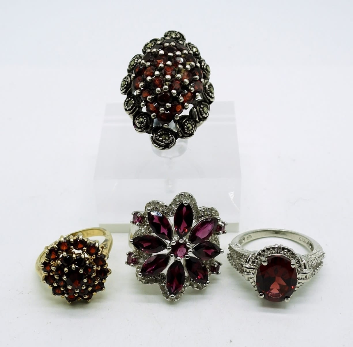 Three Silver Tone 925 Rings with Garnet & Garnet Colored Gemstones, One Gold Tone Sterling Garnet Ring. Sizes 6 & 7. (17.7 DWT)