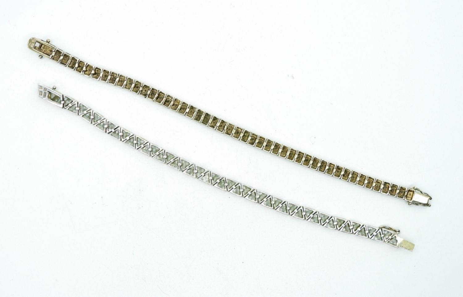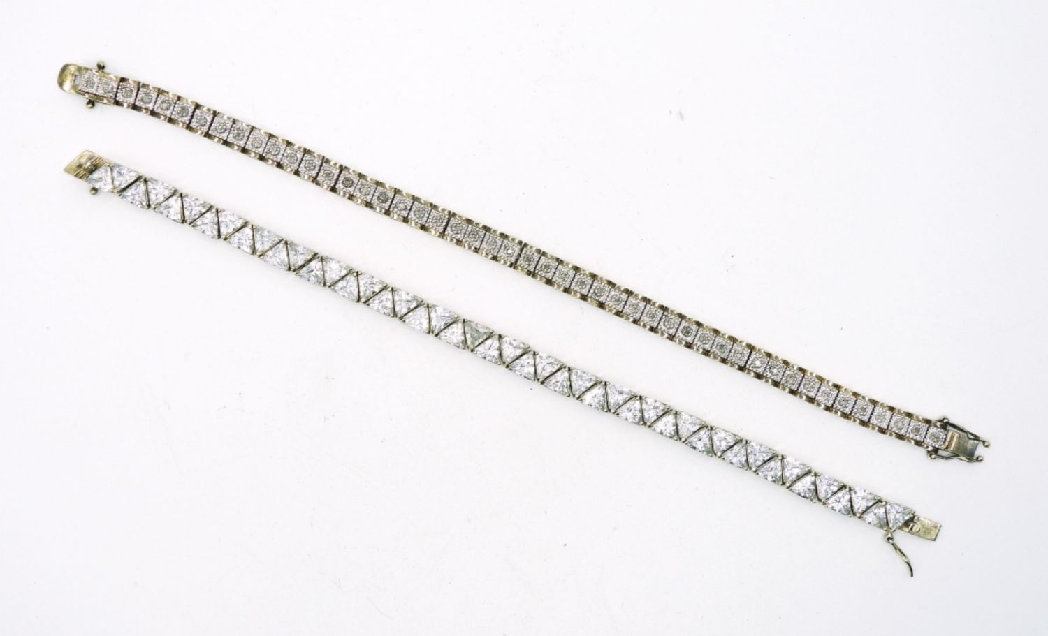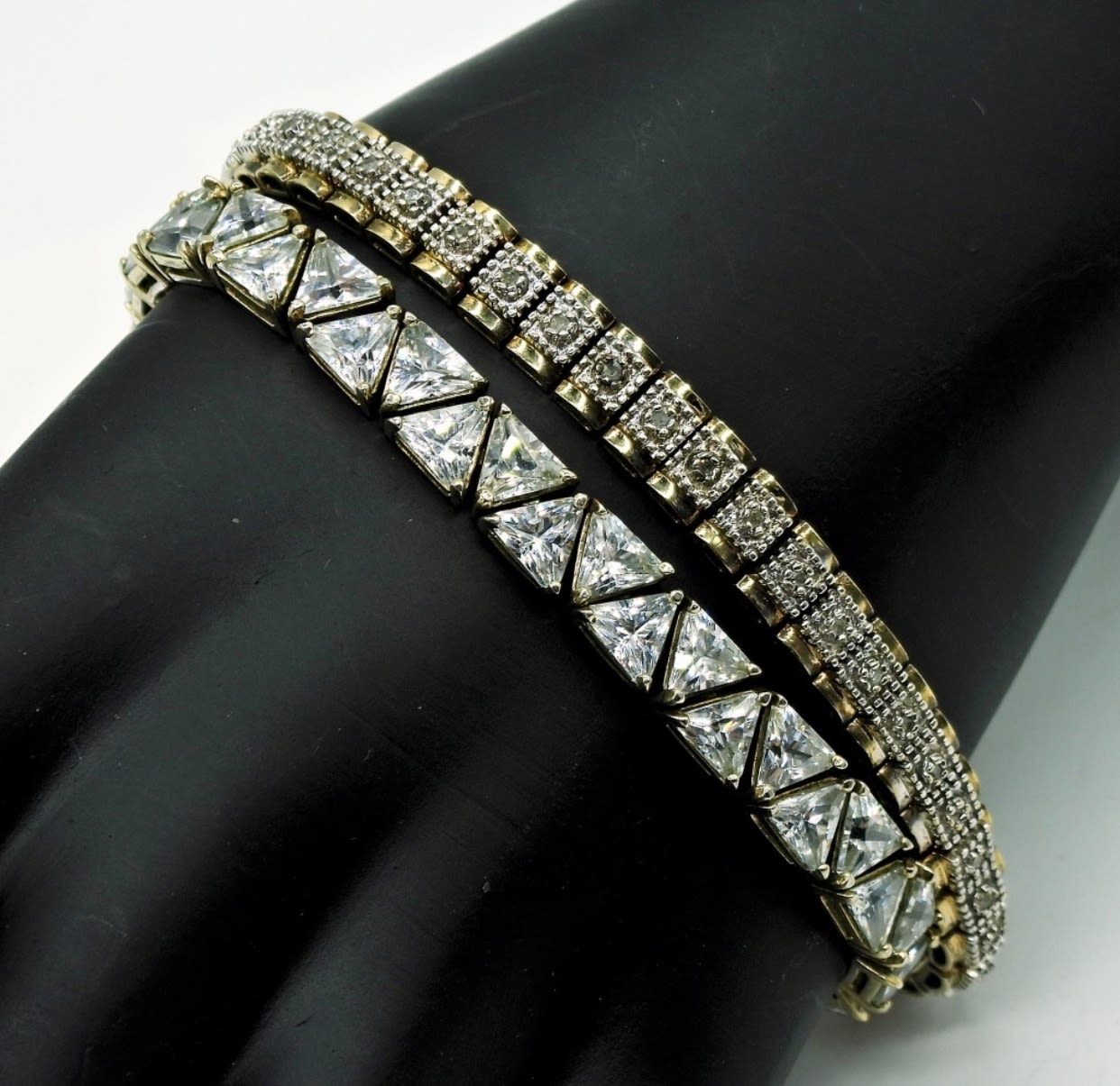 One with Triangle Shaped Cubic Zirconia, One with small round Moissanite stone. Both are beautiful