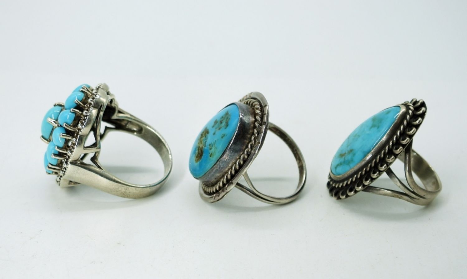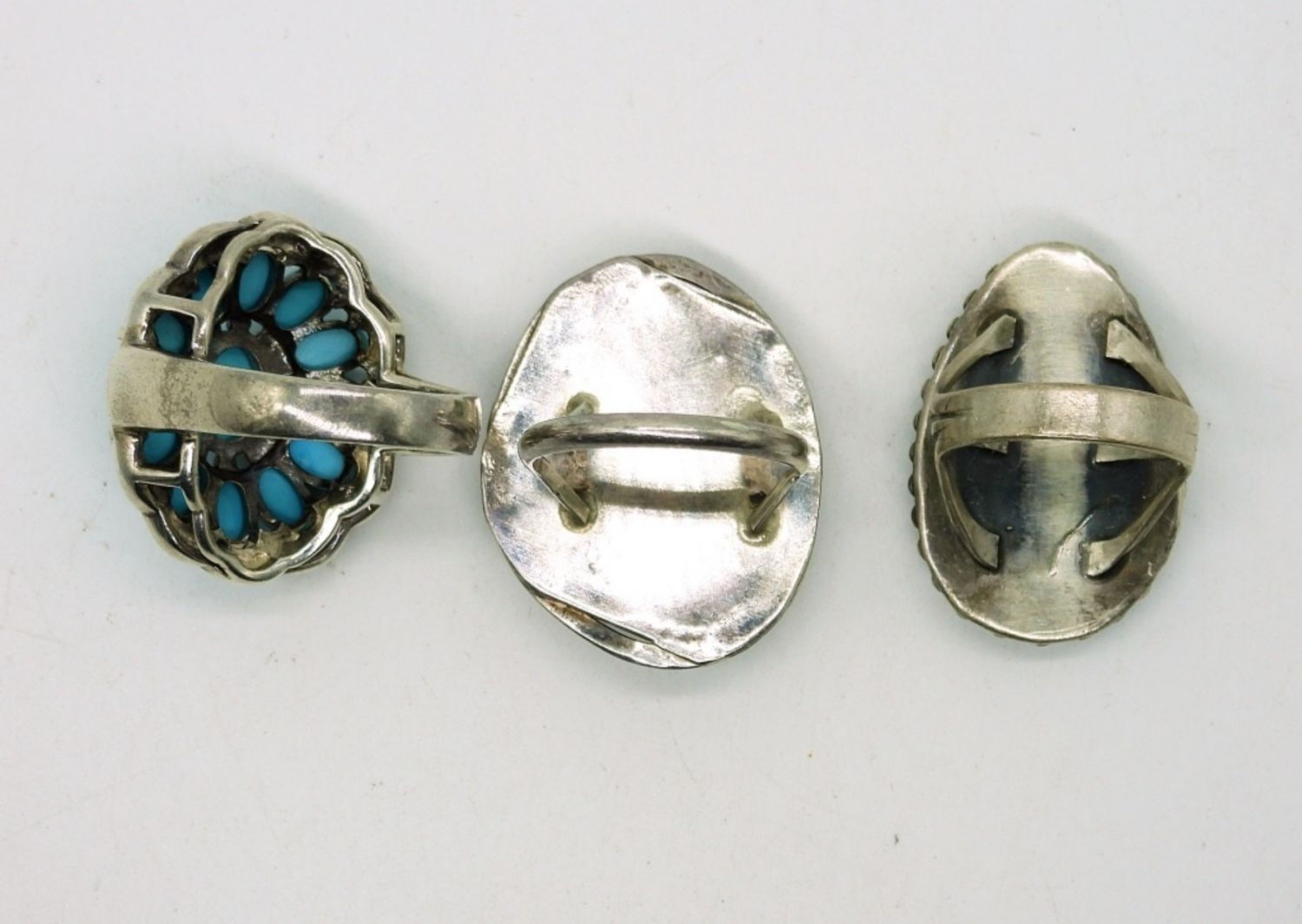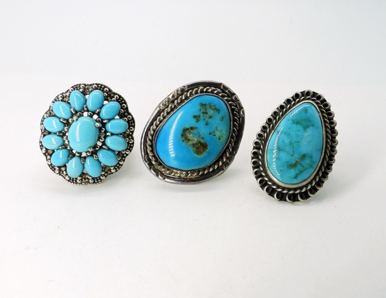 Sterling Turquoise Squash Blossom Style Ring and two other Turquoise in Sterling Rings. Sizes 6.5, 8 & 9. (18.7 DWT)