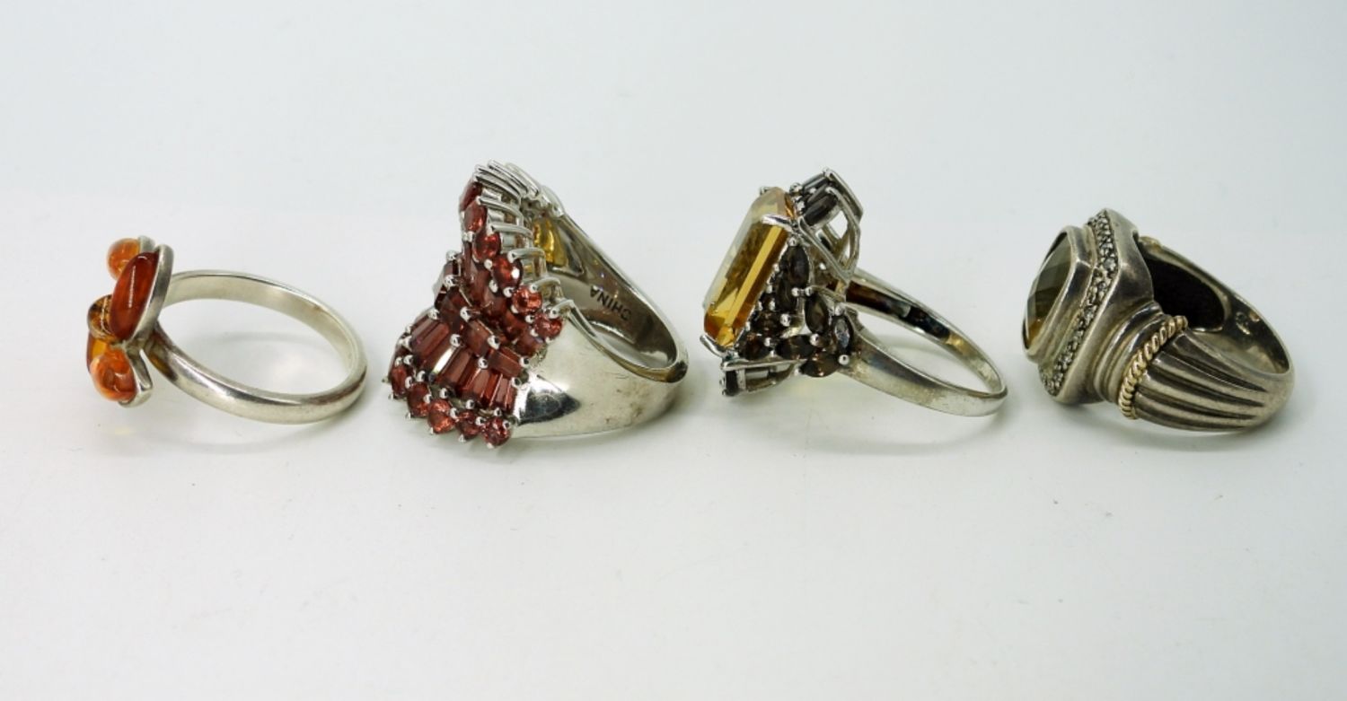 Four Sterling Silver Rings. Amber, Citrine colored gemstones & Garnet colored gemstones. Sizes 7 & 8. (19 DWT)