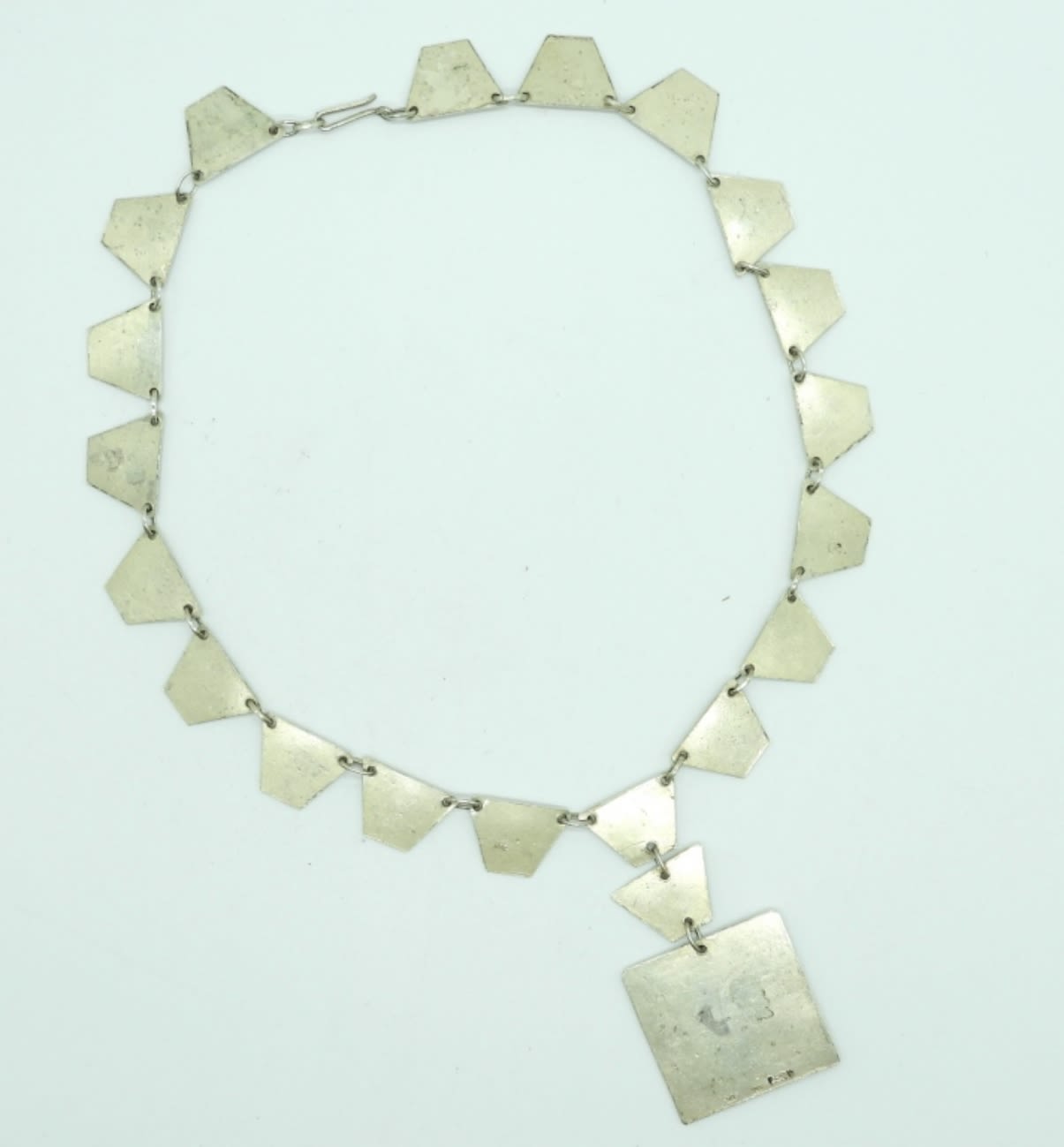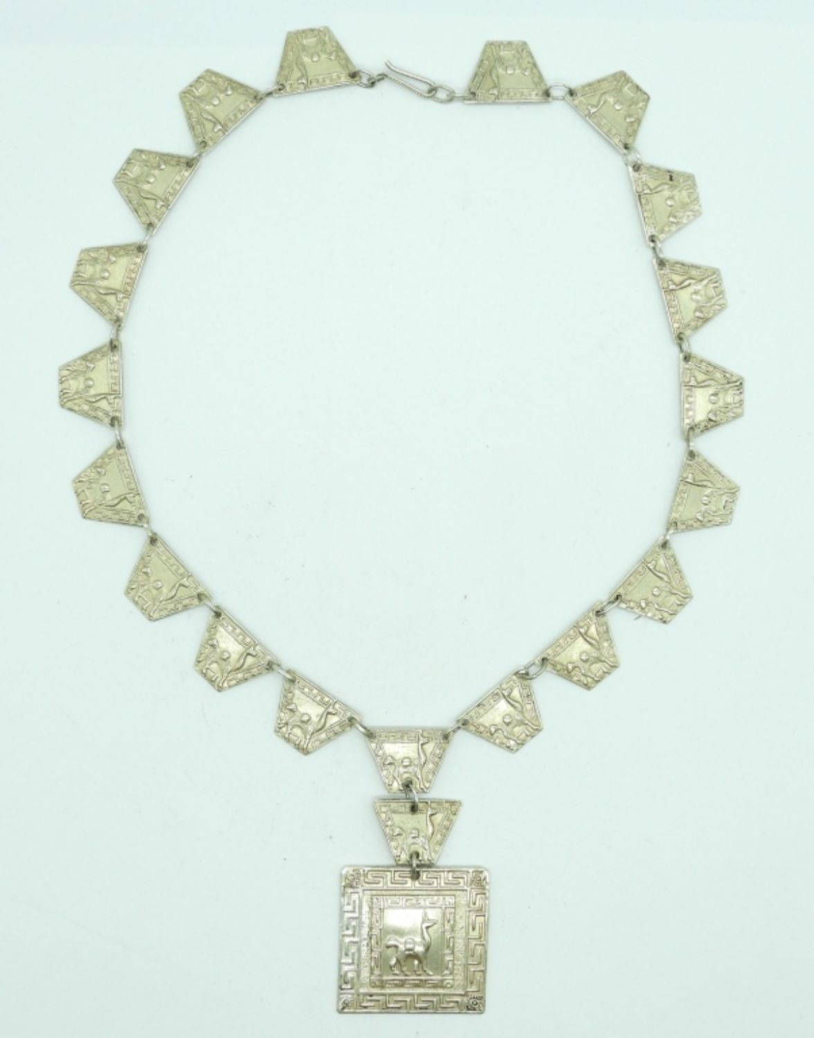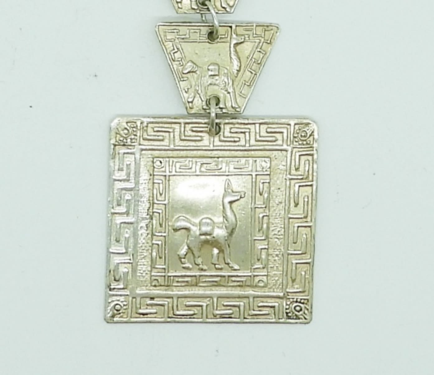 Necklace measure approximately 18 inches with a hook clasp. Graduated tabs have llama motif. (25.8 DWT)