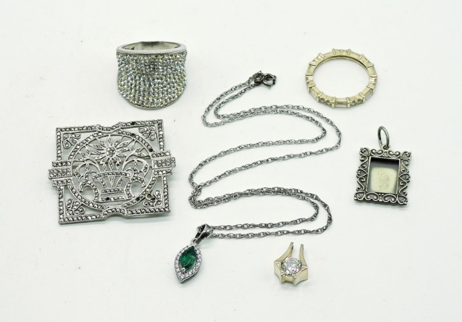 Marcasite Broach, 2 Gemstone rings size 8, Three Mixed Pendants (18.3 DWT)