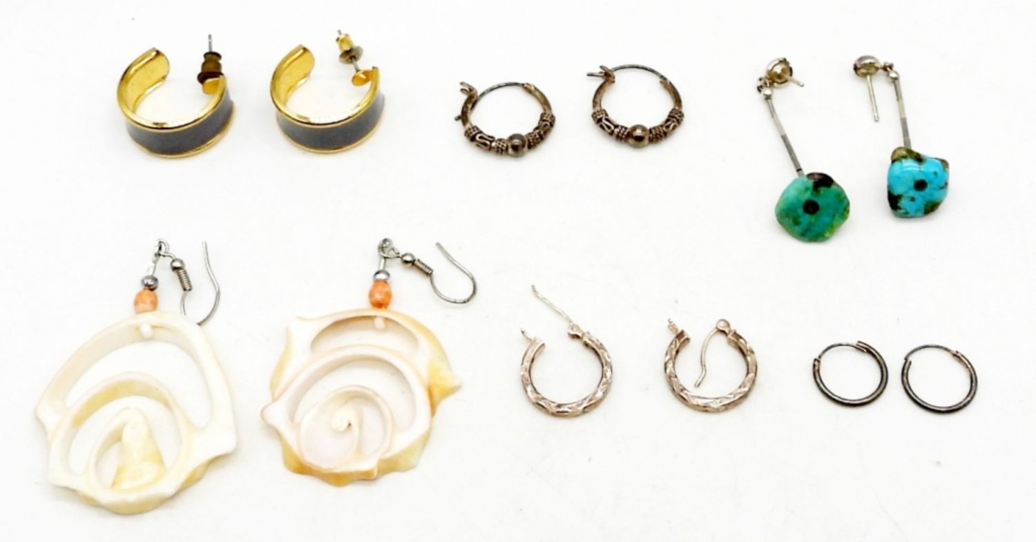 STERLING SILVER EARRINGS WITH TURQUOISE, SHELLS, SILVER & GOLD TONE; 11.2 DWT