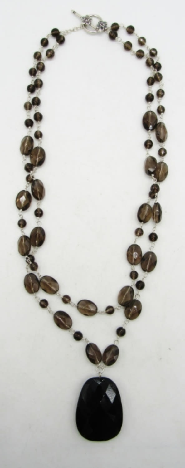 20 inch necklace. Faceted oval smokey quartz beads with faceted black onyx pendant. Pendant measures 1.5 inches long. This necklace is new and very stunning! (DWT 30.6)
