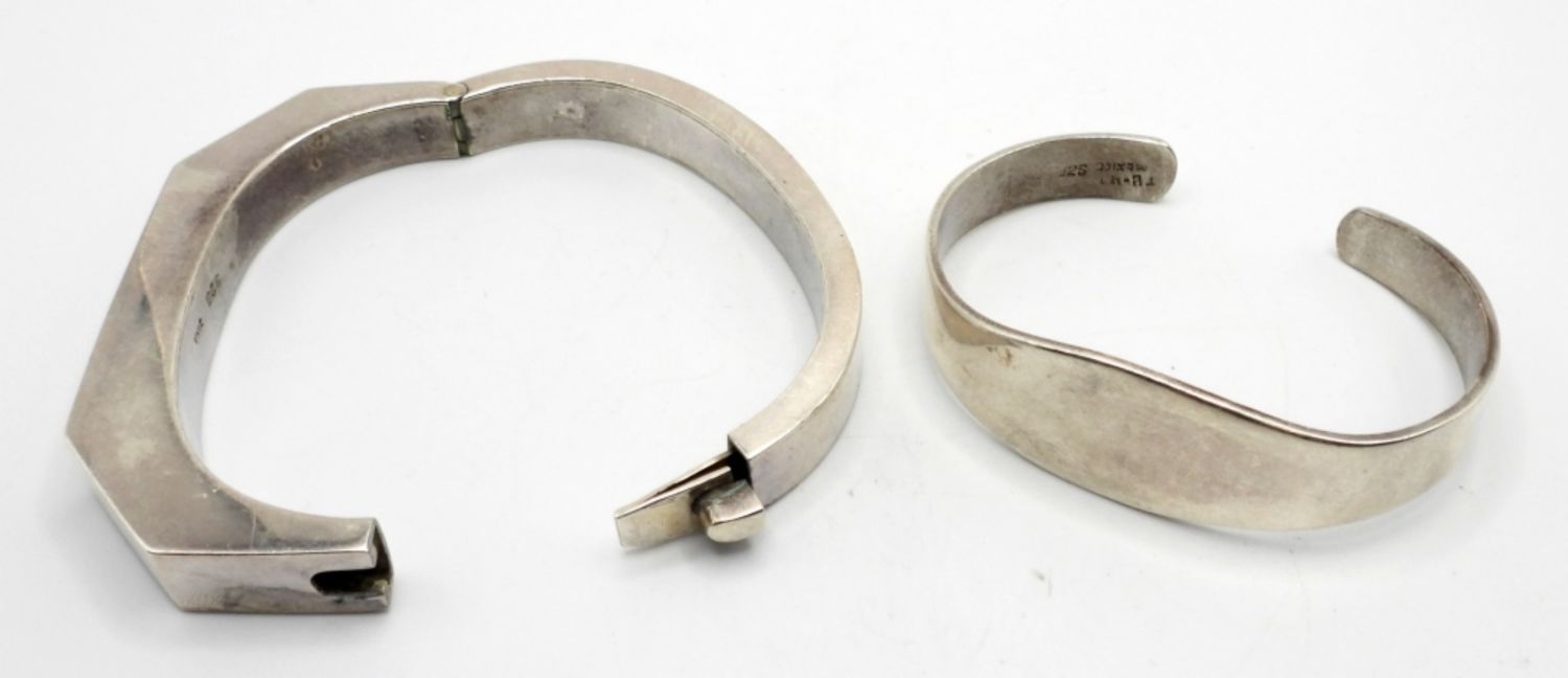 One Victoria Taxco Mexico bangle bracelet with working clasp, 7 inches, and one TB-41 Sterling cuff bracelet, 6 inches. Both in good condition. (41.7 DWT)