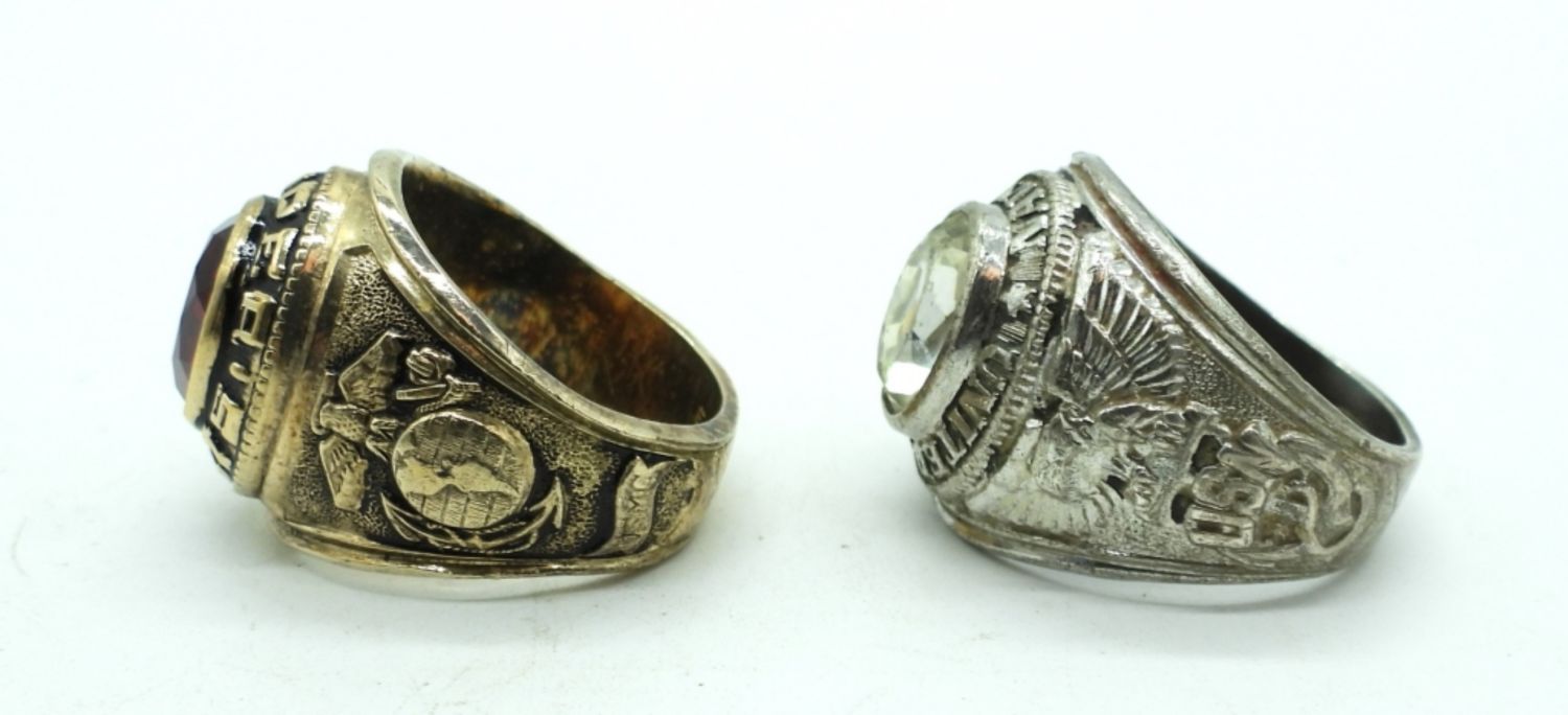 One gold tone 925 US Marines Semper Fidelis Ring with Red Stone size 10, One US Navy Clear Stone Ring size 10, and one US Navy Service pin. (30.3 DWT)