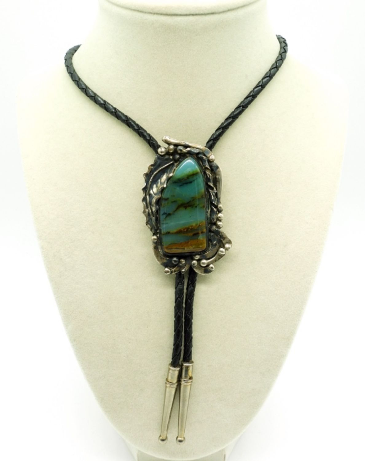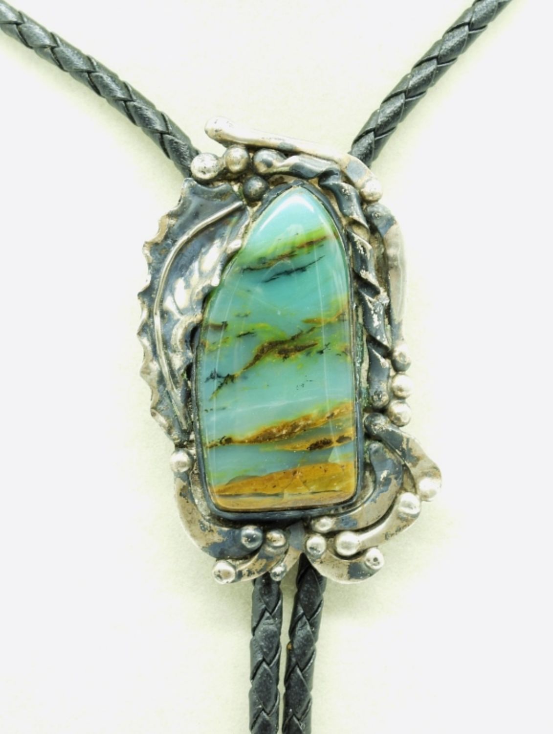 Sterling Silver Handcrafted Aqua Chalcedony, Leather Bolo Tie. 36″. (30.4 DWT)