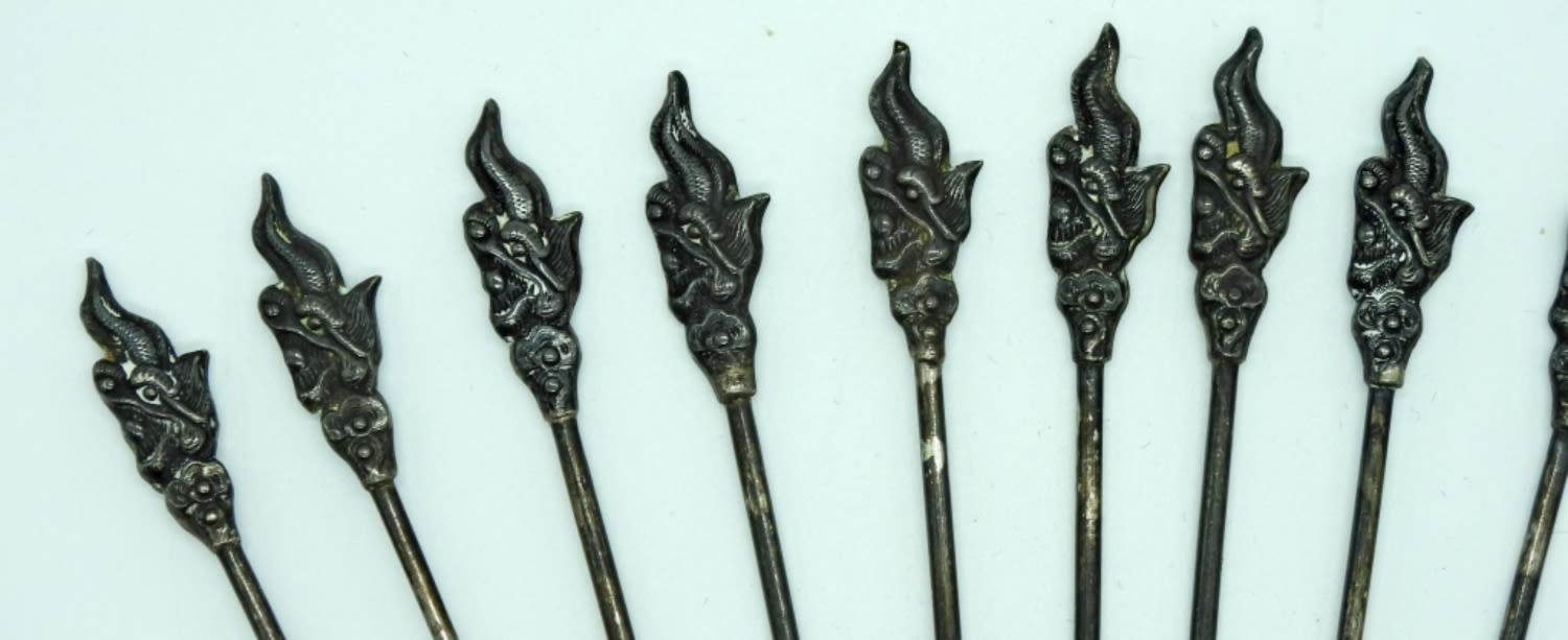 Vintage Sterling cocktail olive forks. One is missing the tines. Dragon head embellishes the end of the fork. (27 DWT)