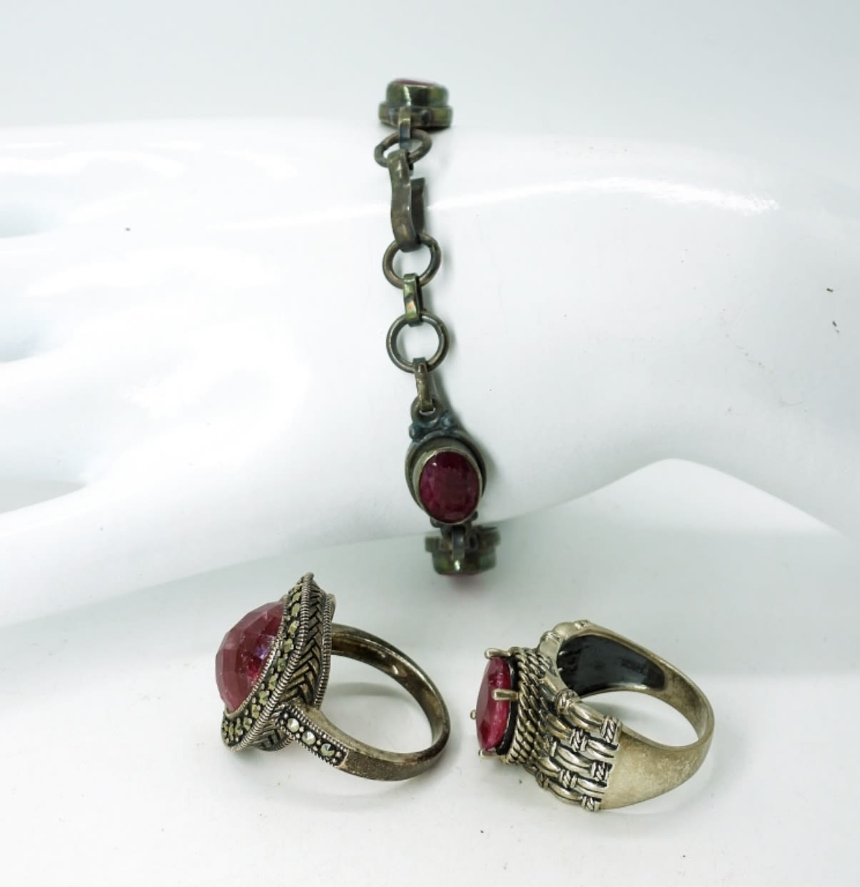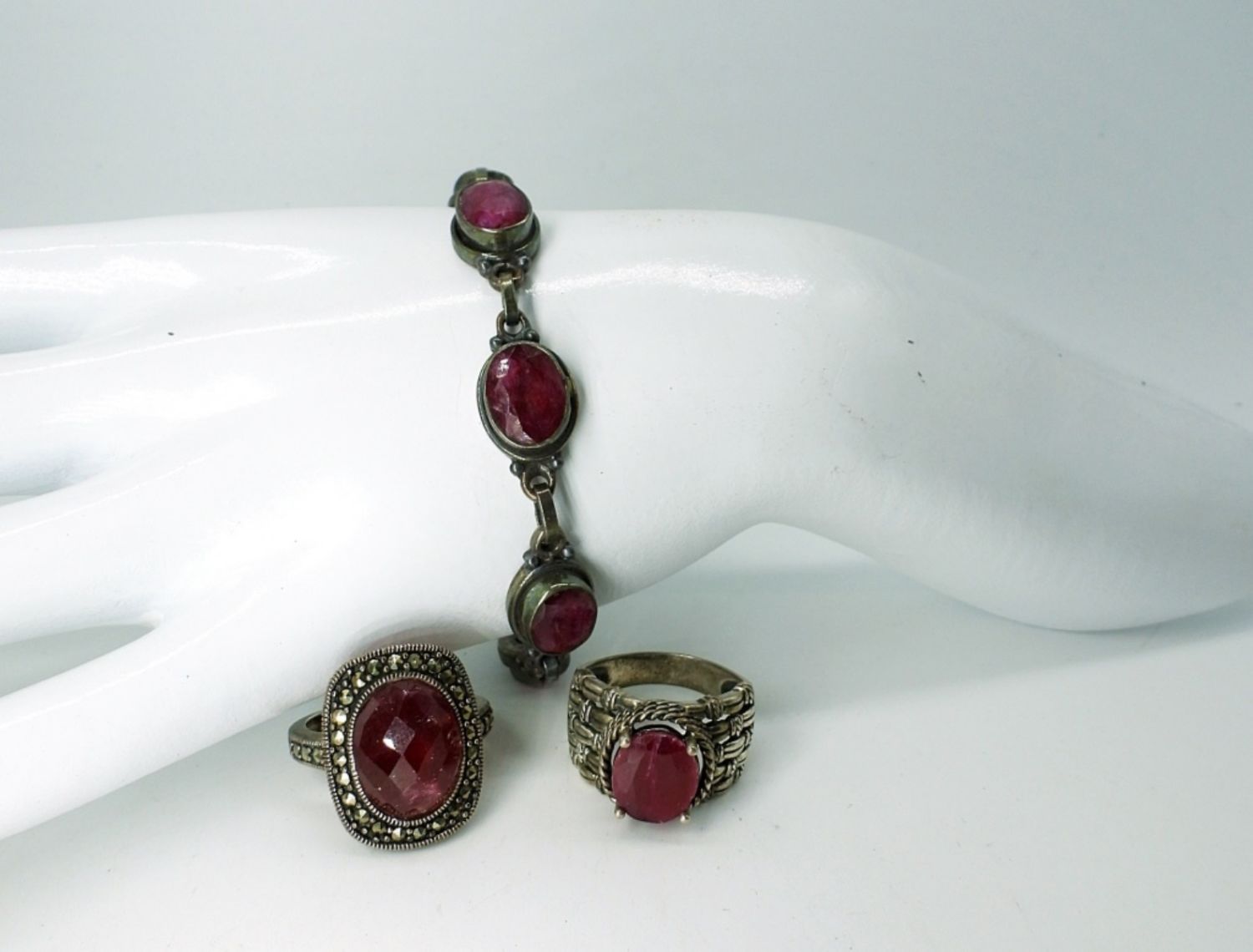 Two Sterling Silver, Natural Ruby Rings and a Sterling Bracelet with Natural Rubies. Rings are size 10 and bracelet measures 7″. (26.8 DWT) Natural Rubies are REAL Rubies, They are just unpolished.