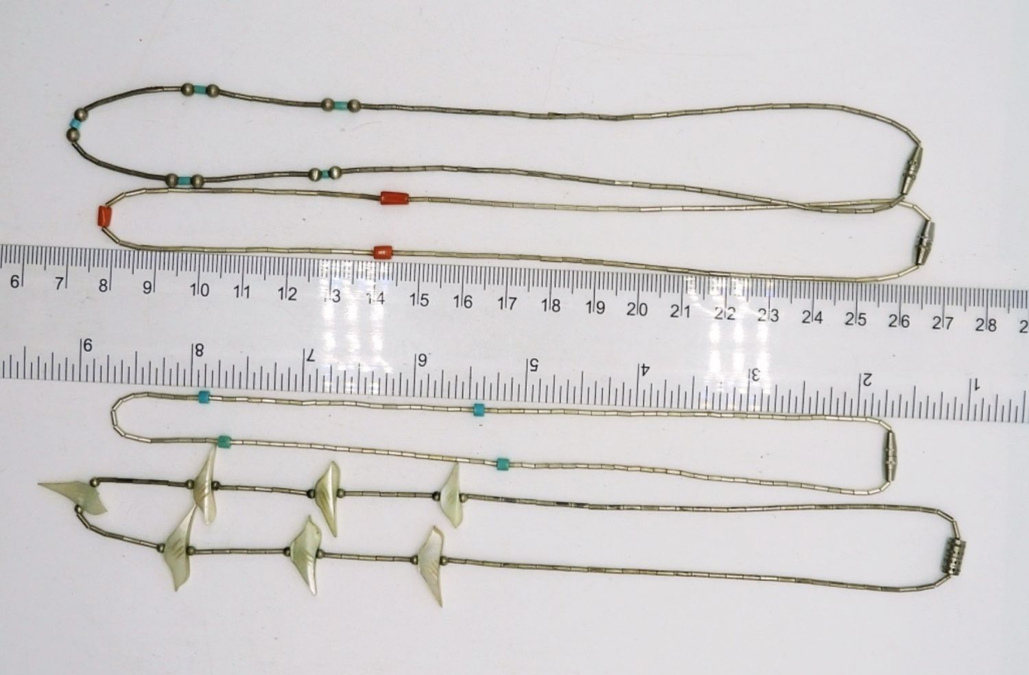 Four Liquid Silver Necklaces. Three with small colorful beads (14″) and One Mother of Pearl Bird Fetish Necklace (16″). (9.8 DWT)