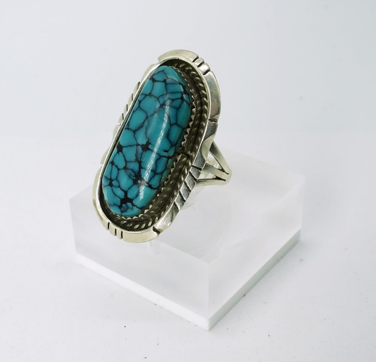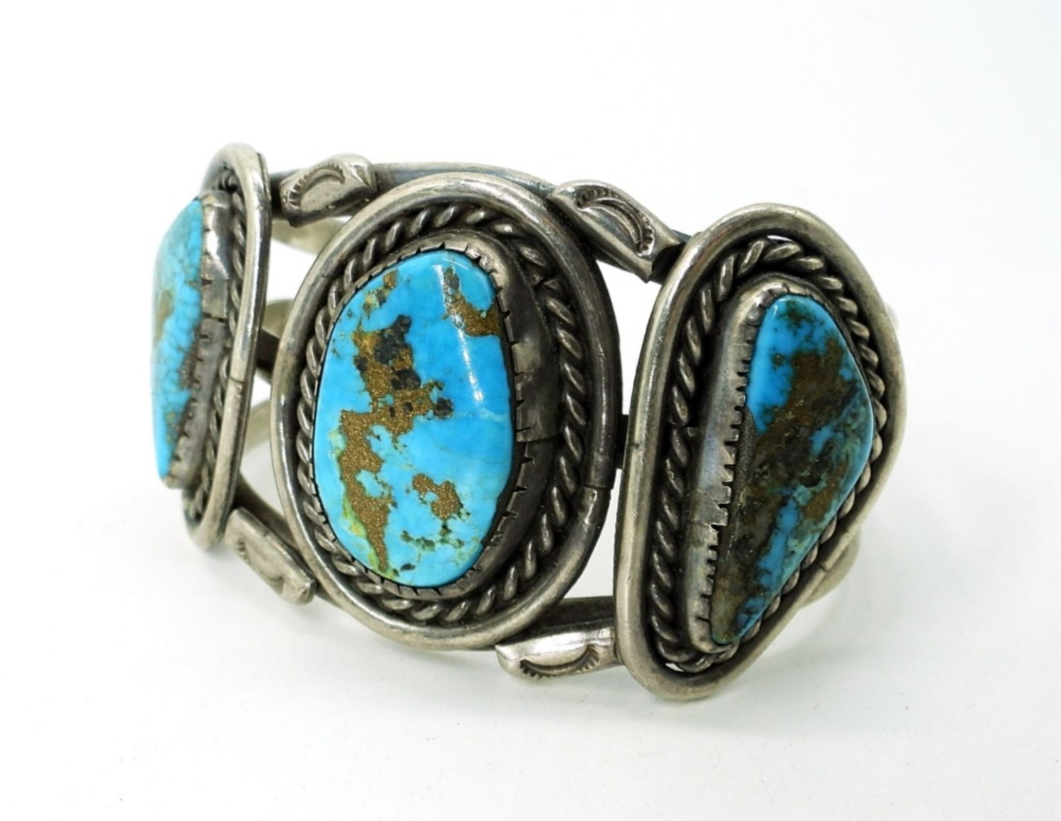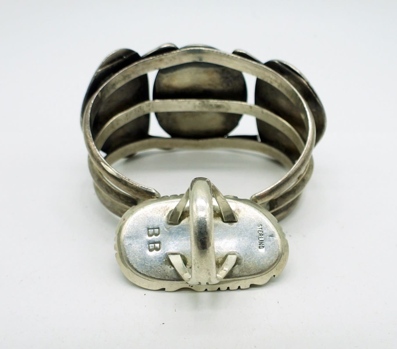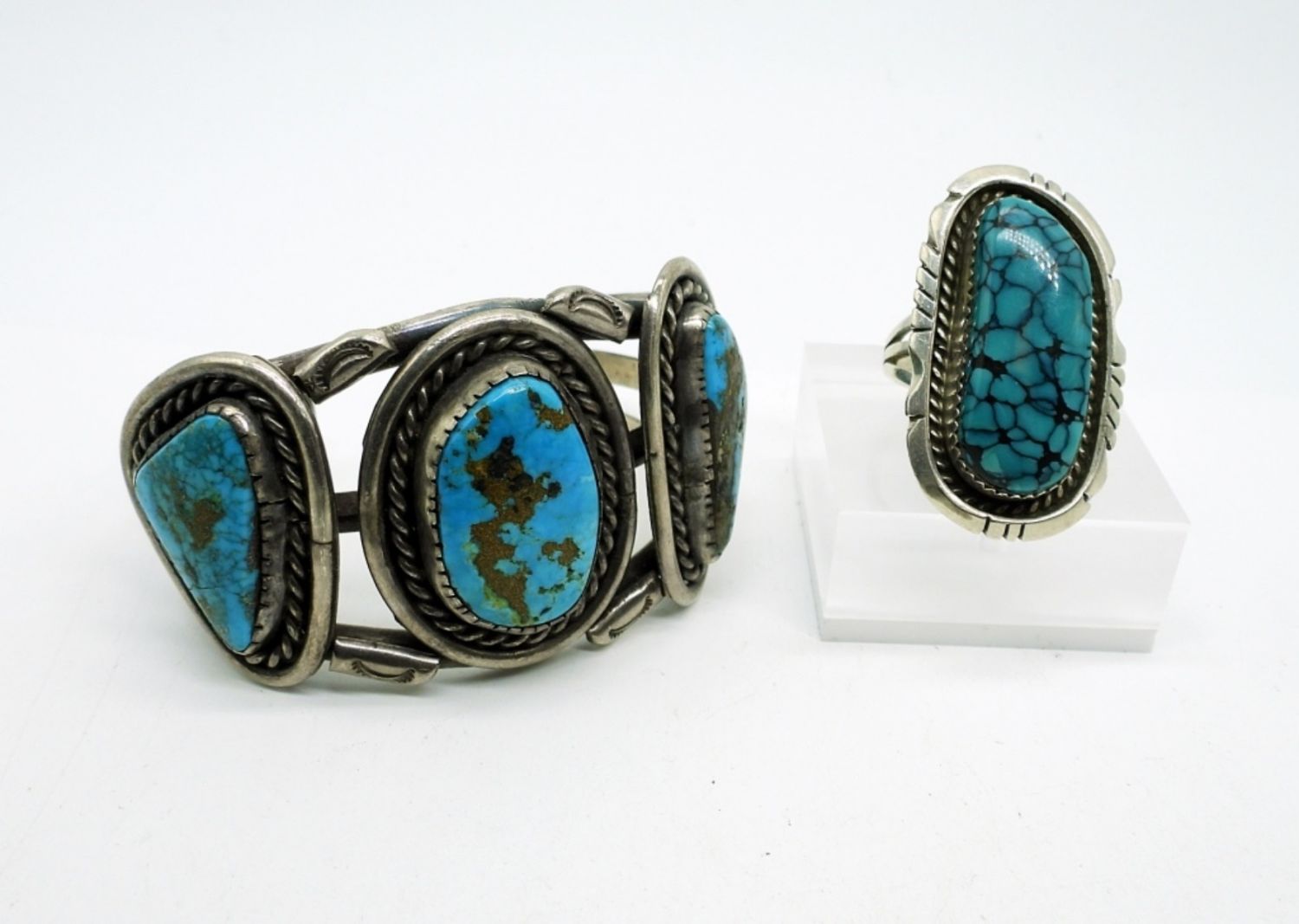 Sterling Silver with Large Turquoise Gemstones on a 5″ Cuff Bracelet and a Size 7 Ring. Ring is marked “Sterling BB”. These are both heavy pieces in wonderful condition! (51.1 DWT)