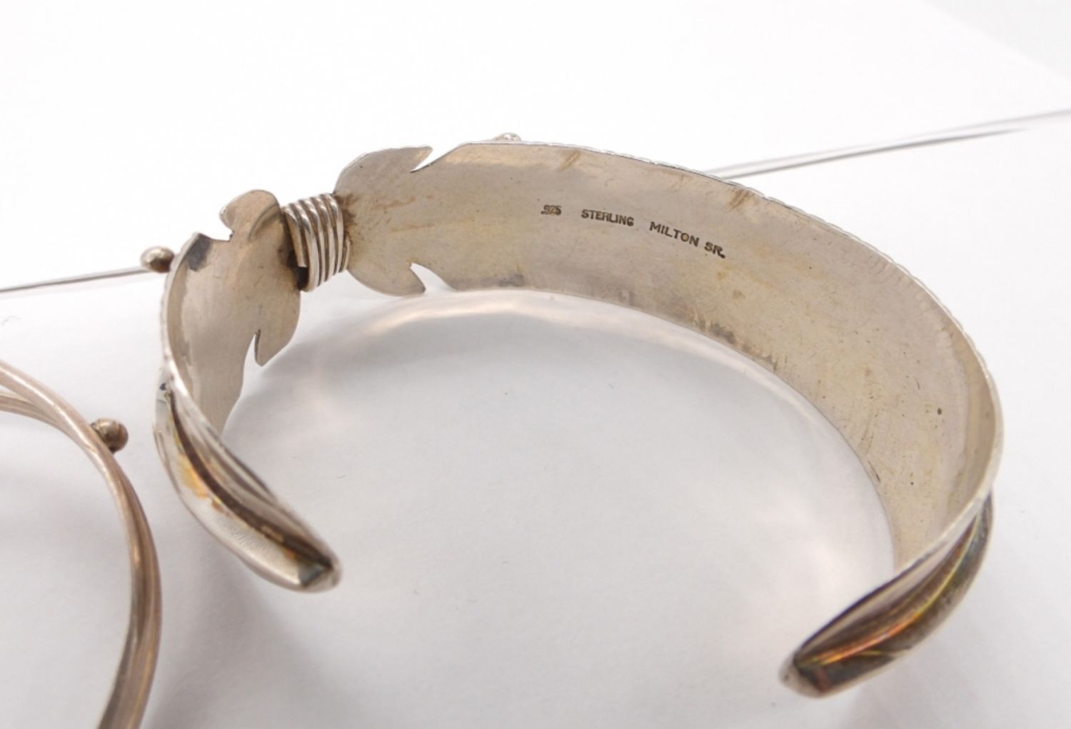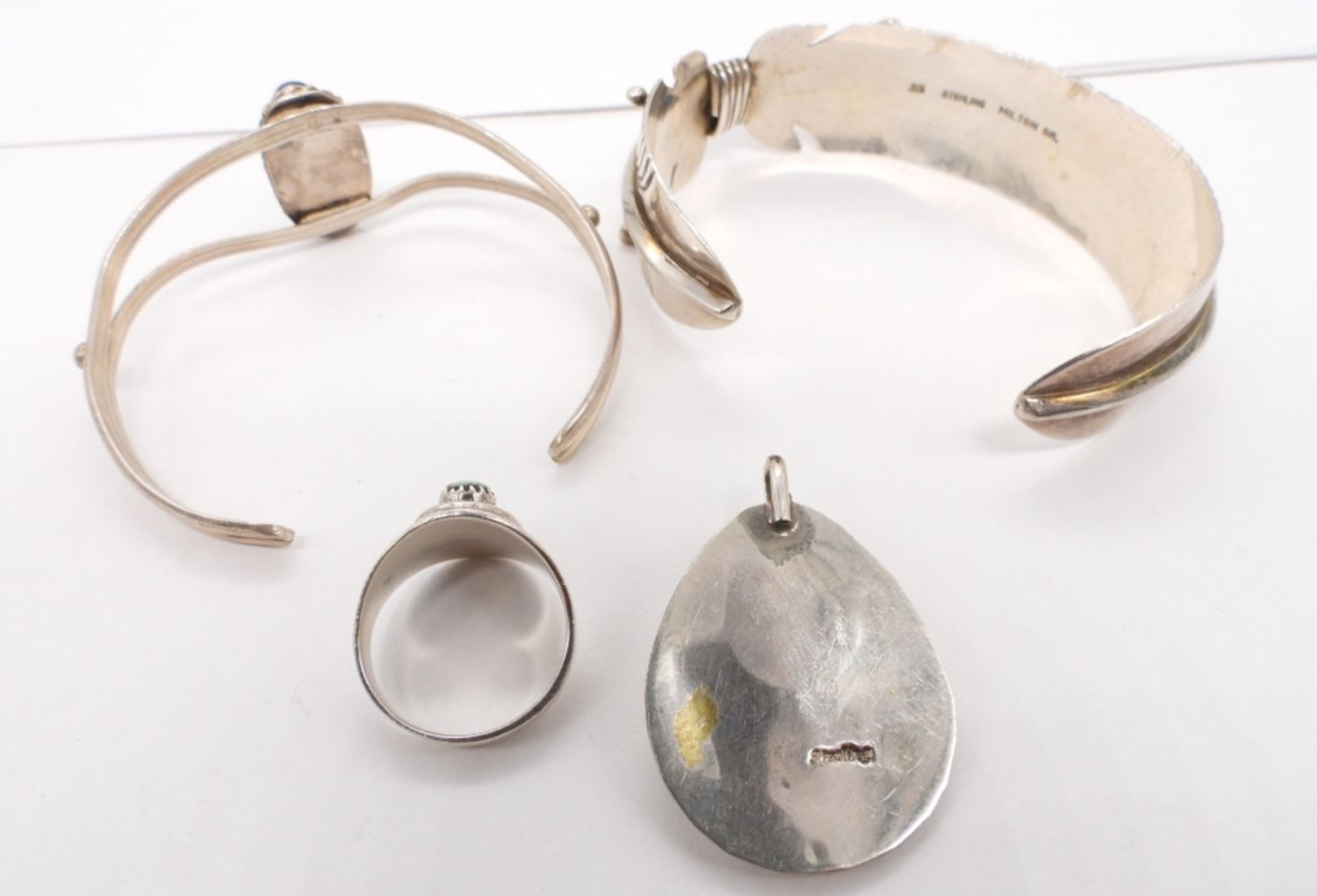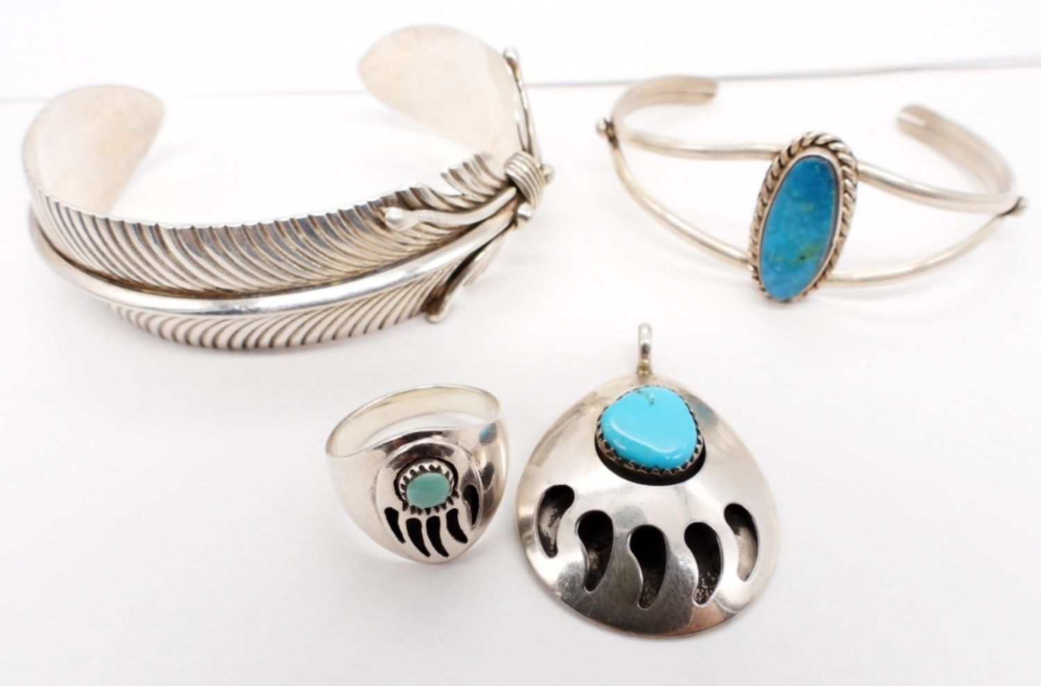 Feather Cuff Bracelet-Vintage Navajo Sterling Silver, Stamped “925 Sterling Milton SR” (6″). Sterling & Turquoise Cuff Bracelet (5″). Bear Claw Sterling Ring and Pendant with Turquoise Gemstones. Ring size 6 3/4.Pendant measures 1.5″x 1″. (27.4 DWT)