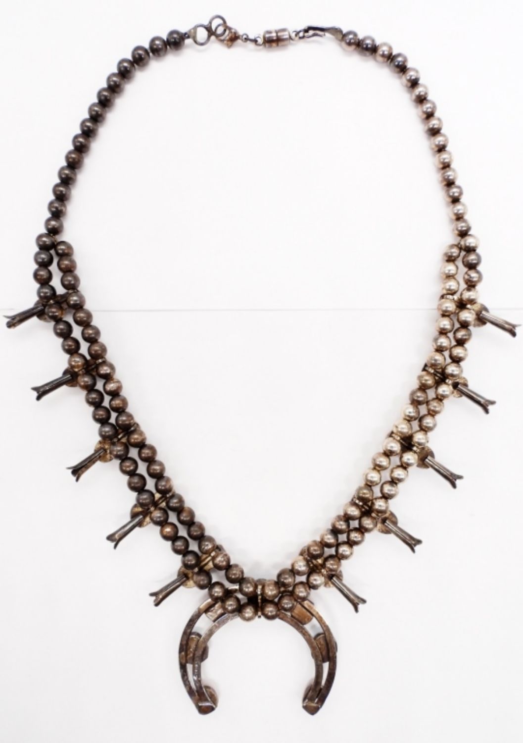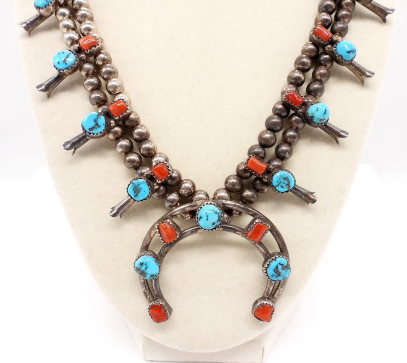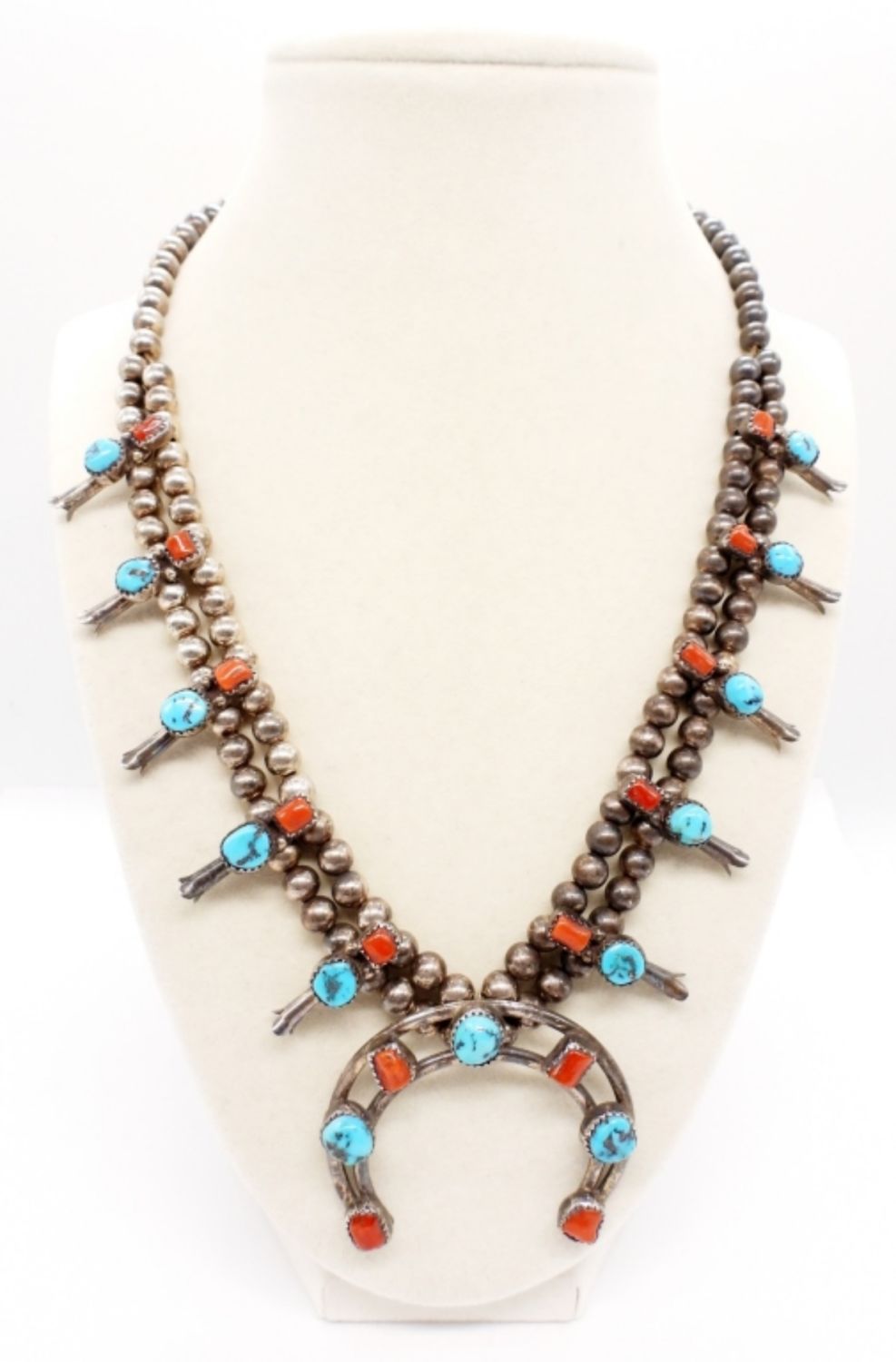 Sterling Silver 19″ Blue and Red Turquoise Squash Blossom Necklace. This has had a magnetic clasp added to the original clasps. Can easily be removed. (39.5 DWT)