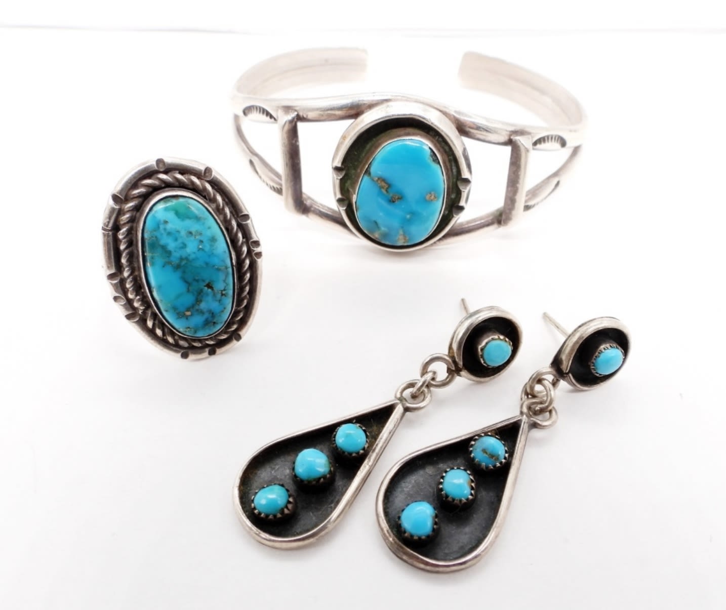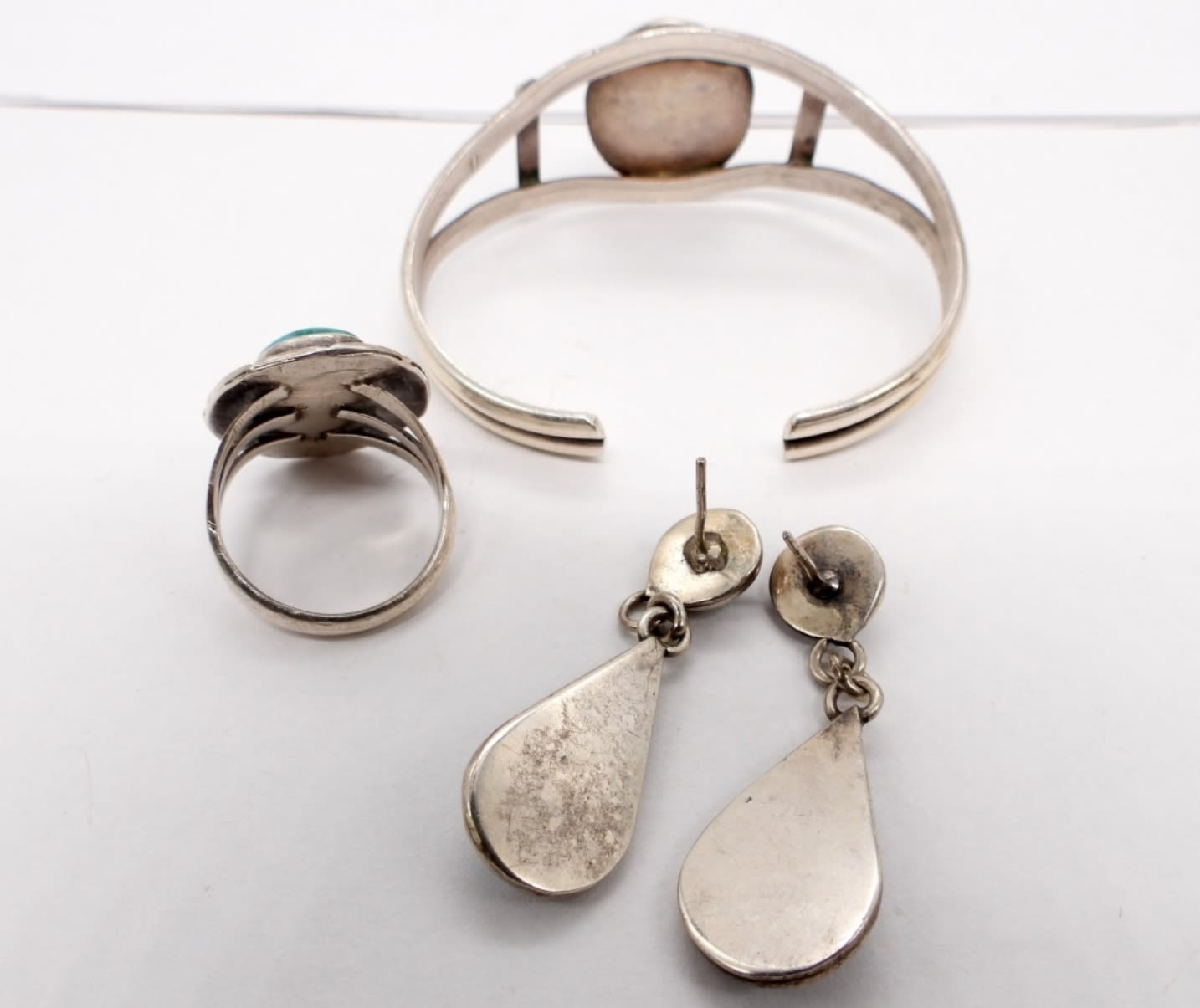 Sterling Turquoise Cuff Bracelet, 5″. Sterling Turquoise Ring Size 6. Teardrop shaped, Sterling Turquoise Earrings. (18.6 DWT)