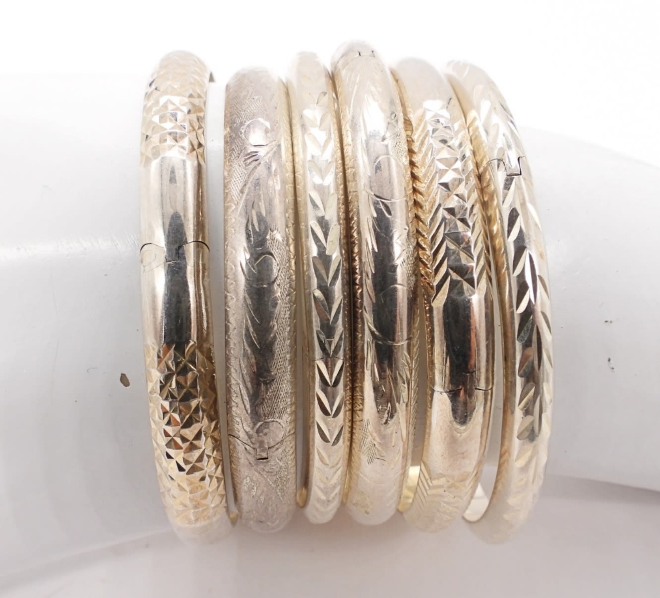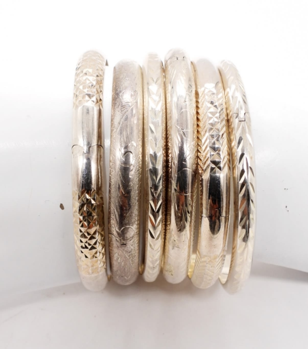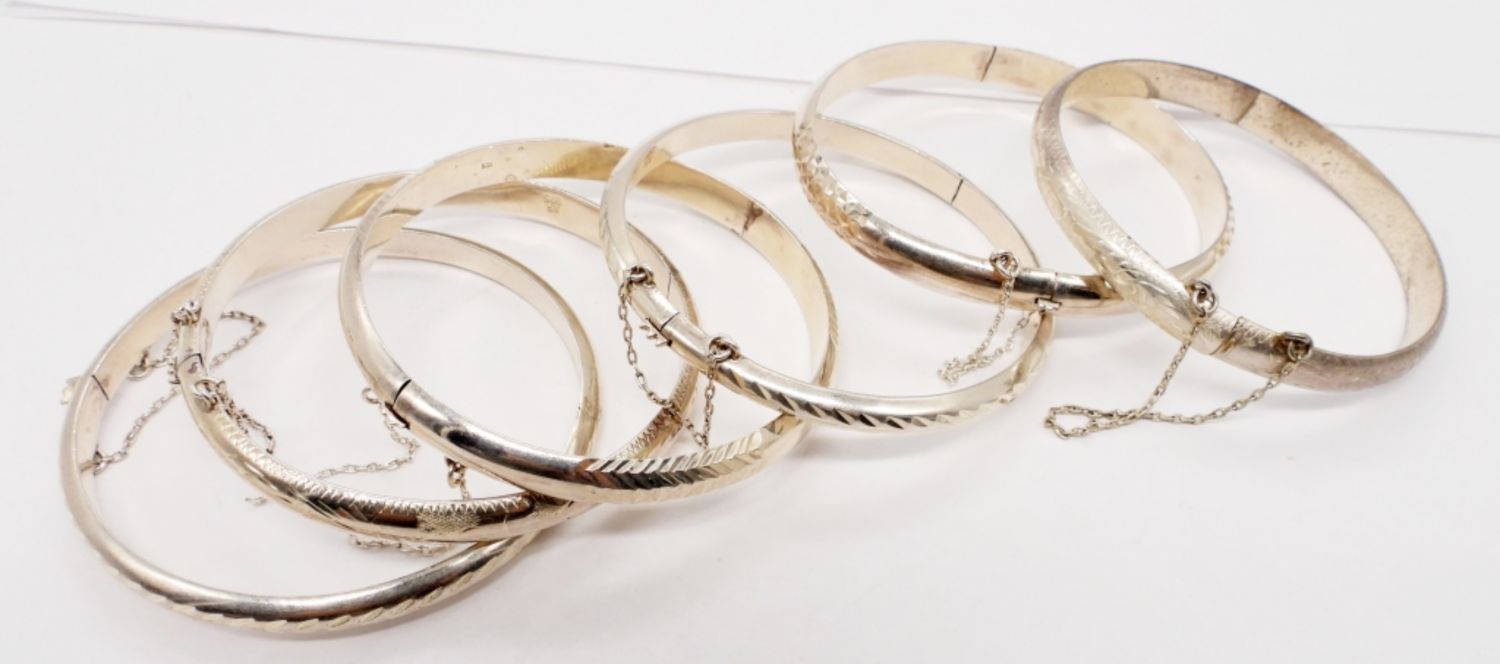 Six Sterling Silver Etched Bangles, all 7″. (32.7 DWT)