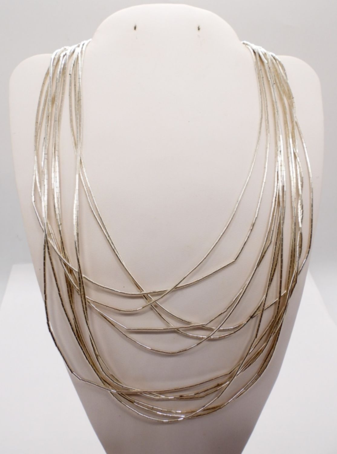 8 Foot Long Liquid Sterling Double Strand Necklace (100 inches long). Sterling Navajo Style Bracelet with Turquoise, 5″. Two Sterling Turquoise Rings, Sizes 7 adjustable and 9. (33.6 DWT)
