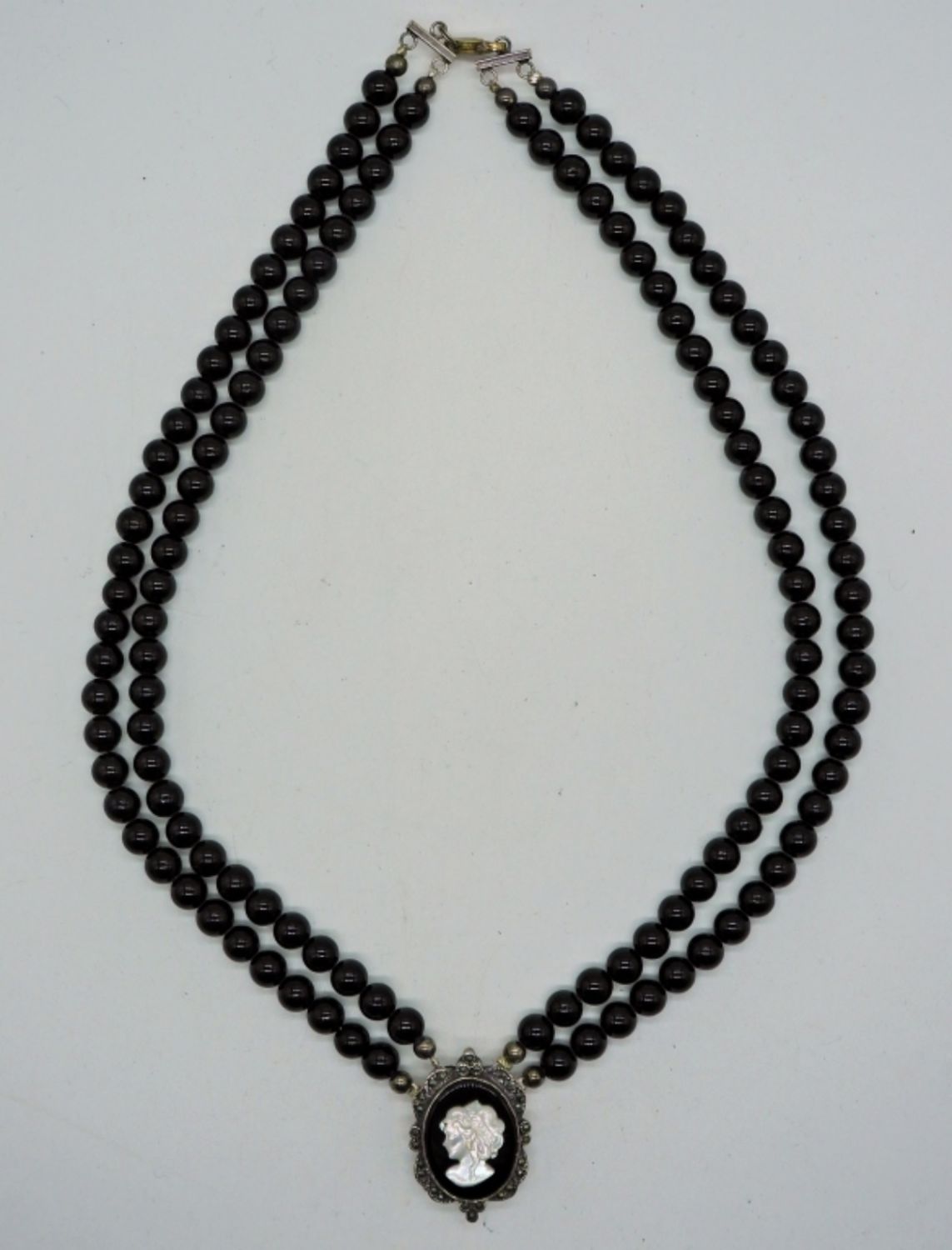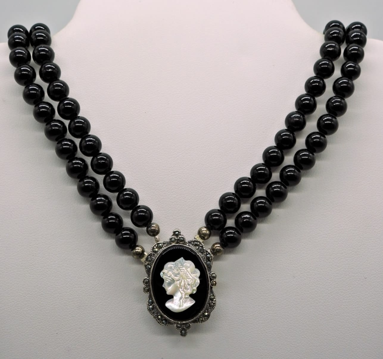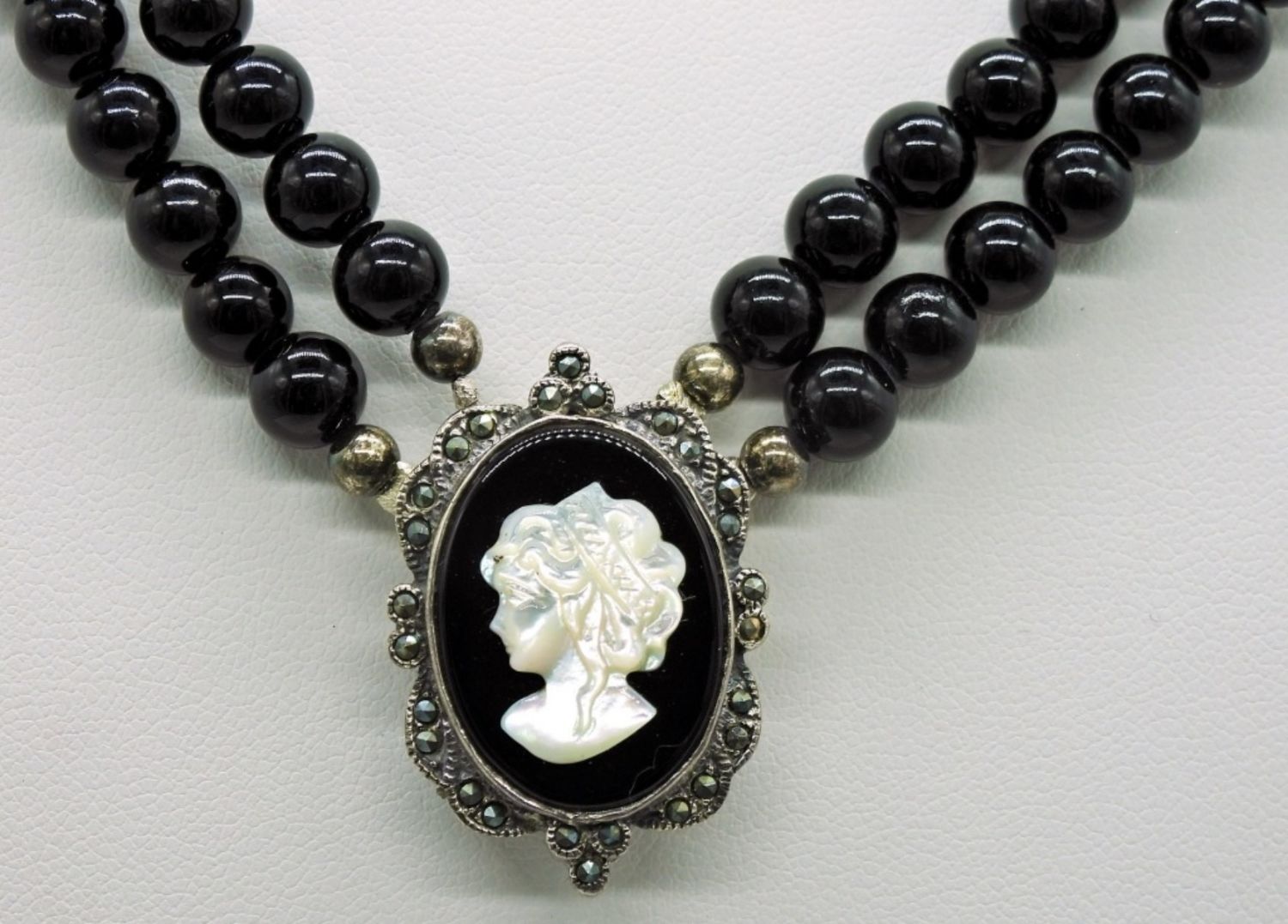 Sterling Black & White Cameo with Black Agate Beads, Marcasite Detailing. Gorgeous! 34.1DWT