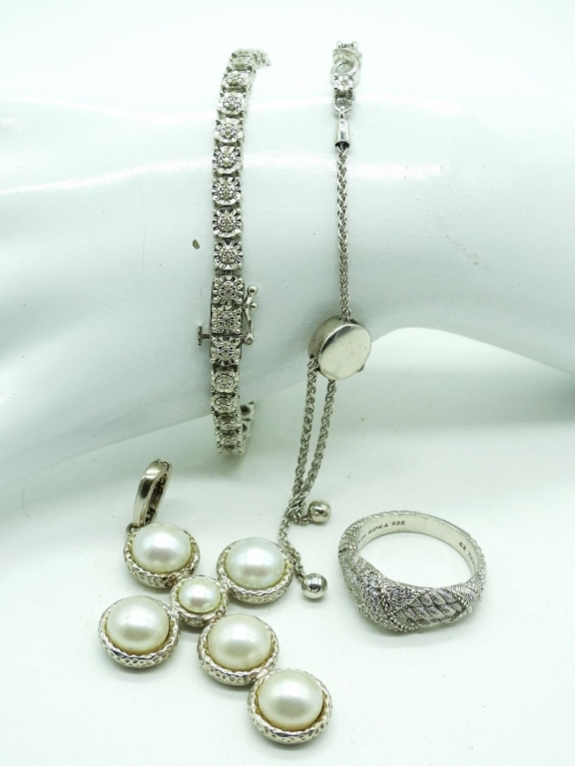 Two Sterling Bracelets. Adjustable bracelet has tiny genuine diamonds. Sterling & White Gemstone Size 9 Ring. Sterling and Faux Pearl Cross Pendant. 25.1DWT