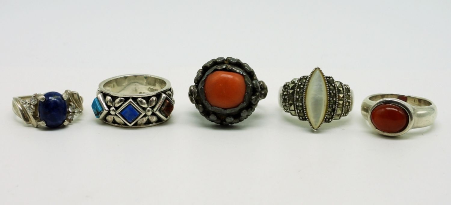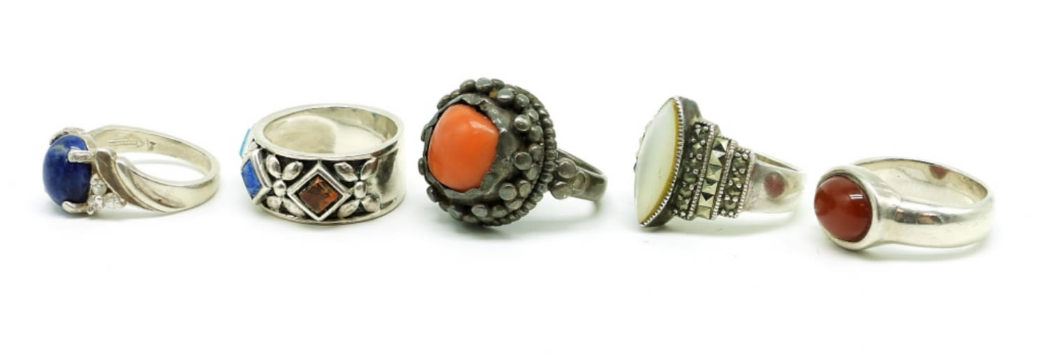Five Sterling Rings, Lapis, Carnelian & Mother of Pearl. Sizes 5-8. 22.9 DWT