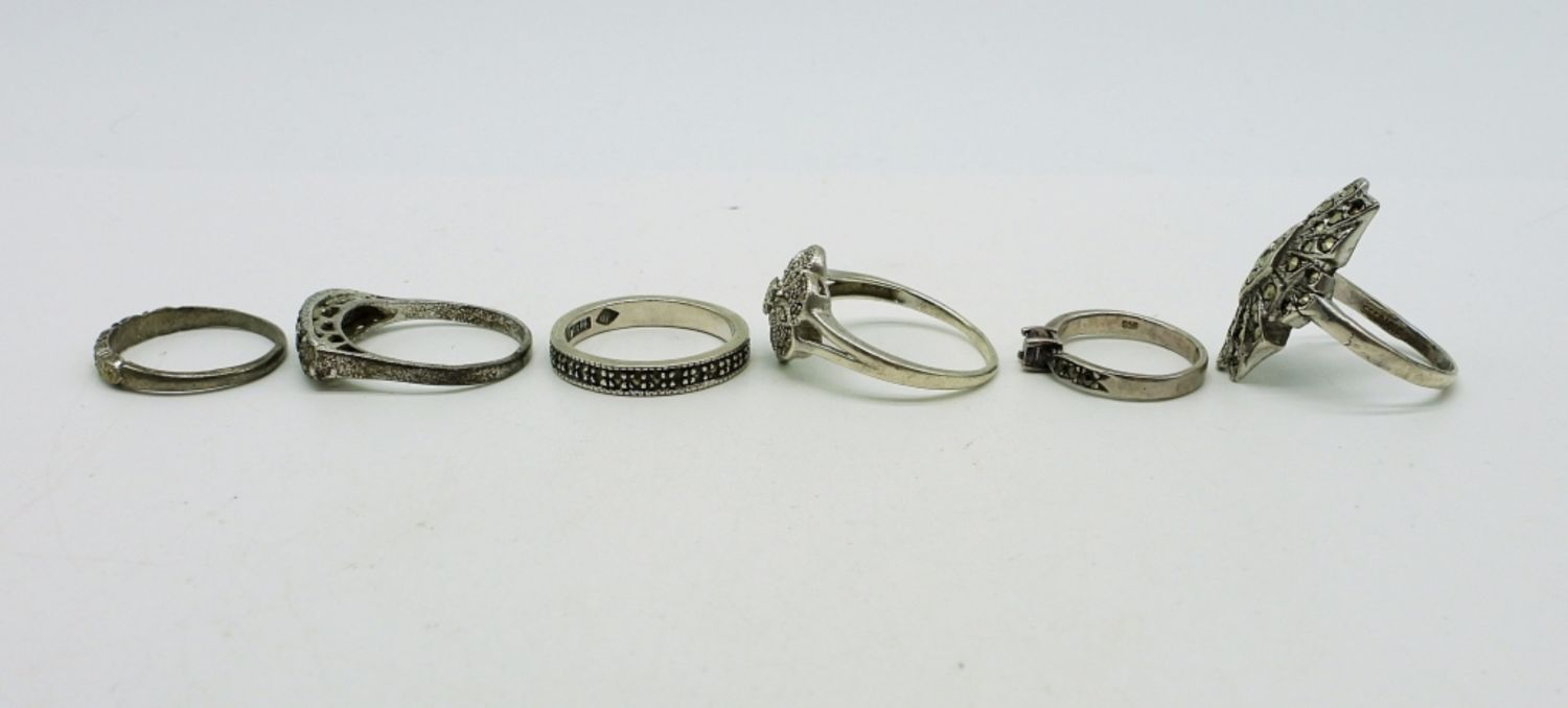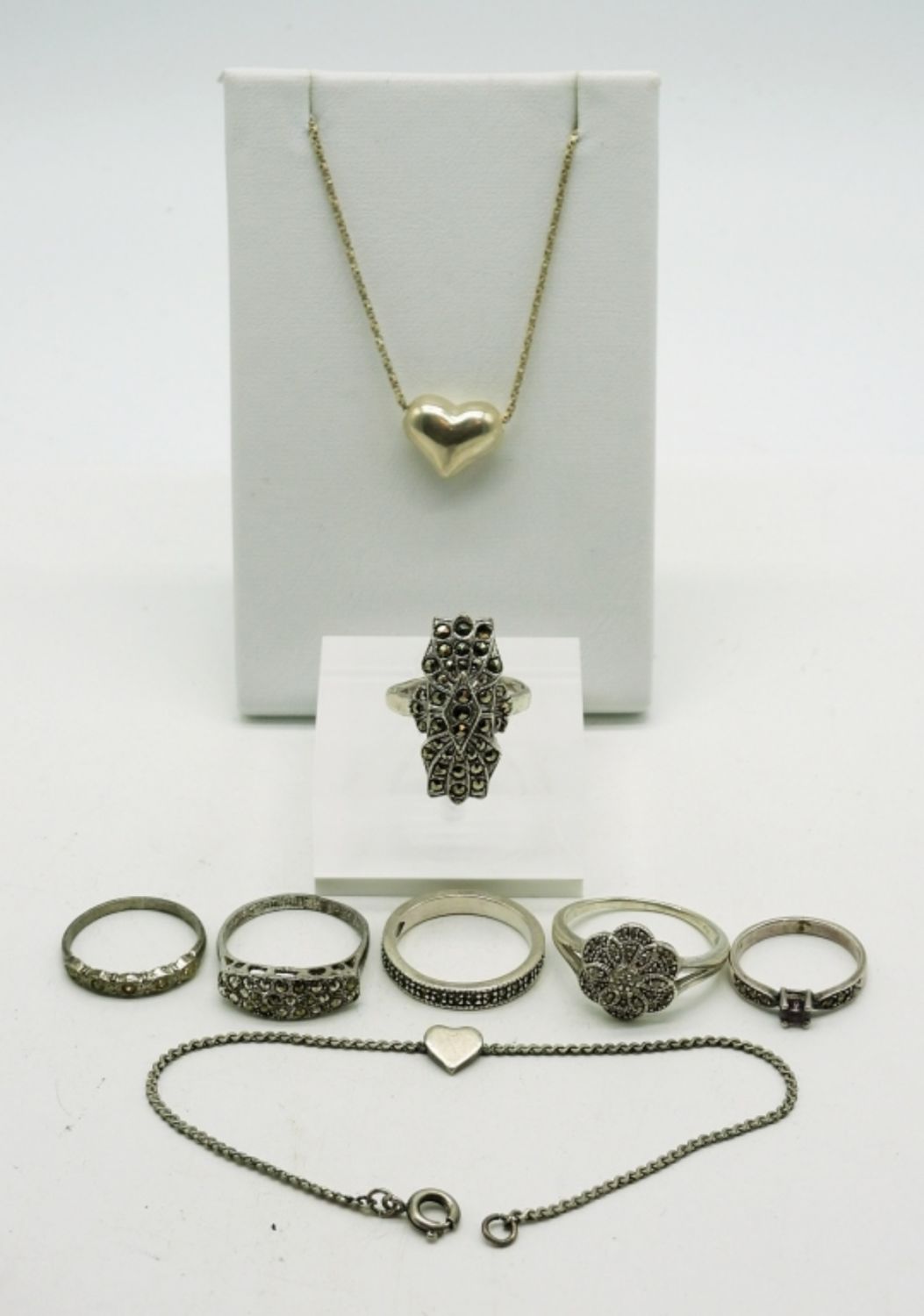 Five Sterling Marcasite Ring, One Marcasite & Amethyst Ring. Sizes 4-9. Sterling Heart Pendant on 16 inch Sterling Chain. Heart Bracelet, Sterling, 7 inches. 14.1 DWT