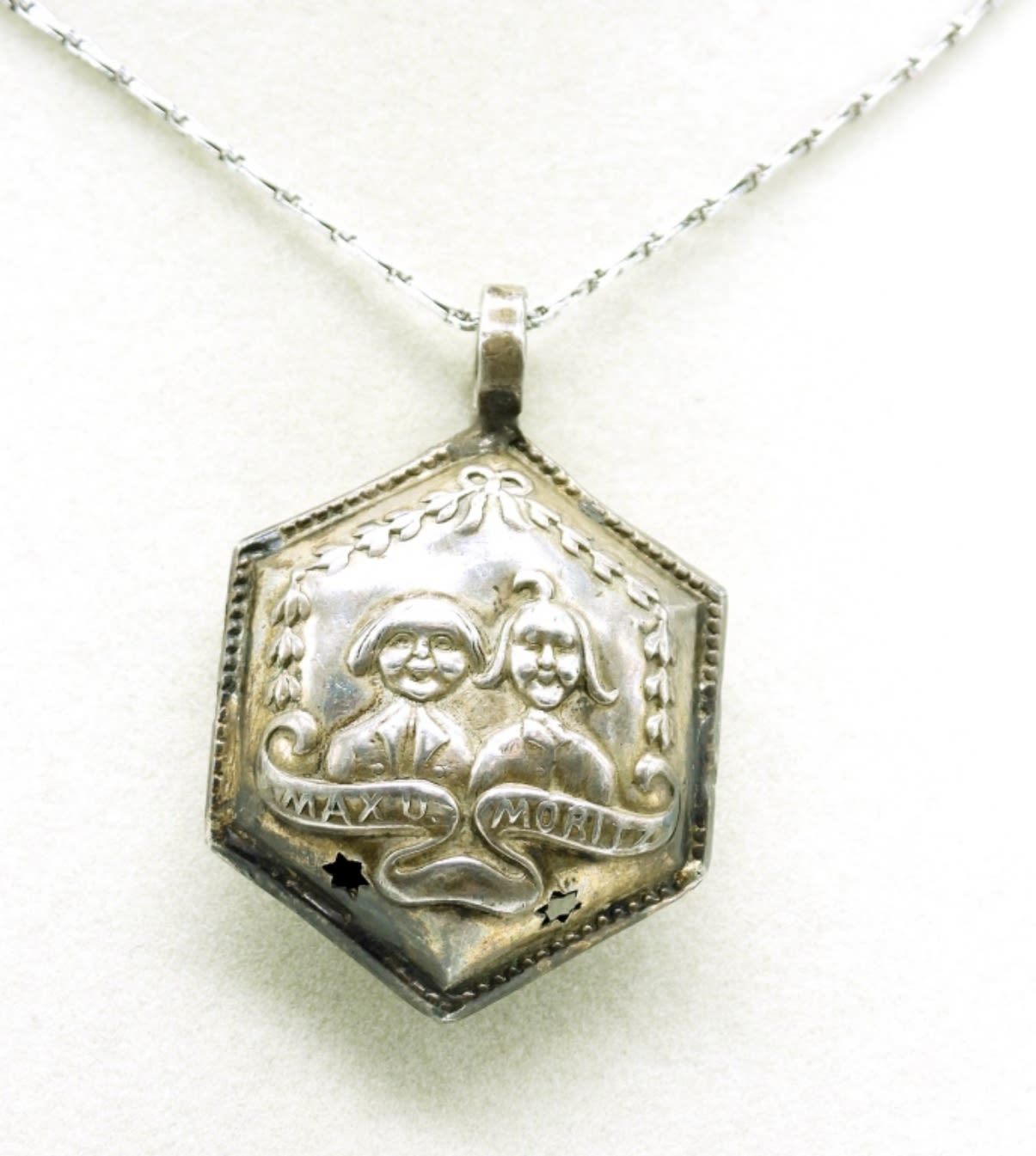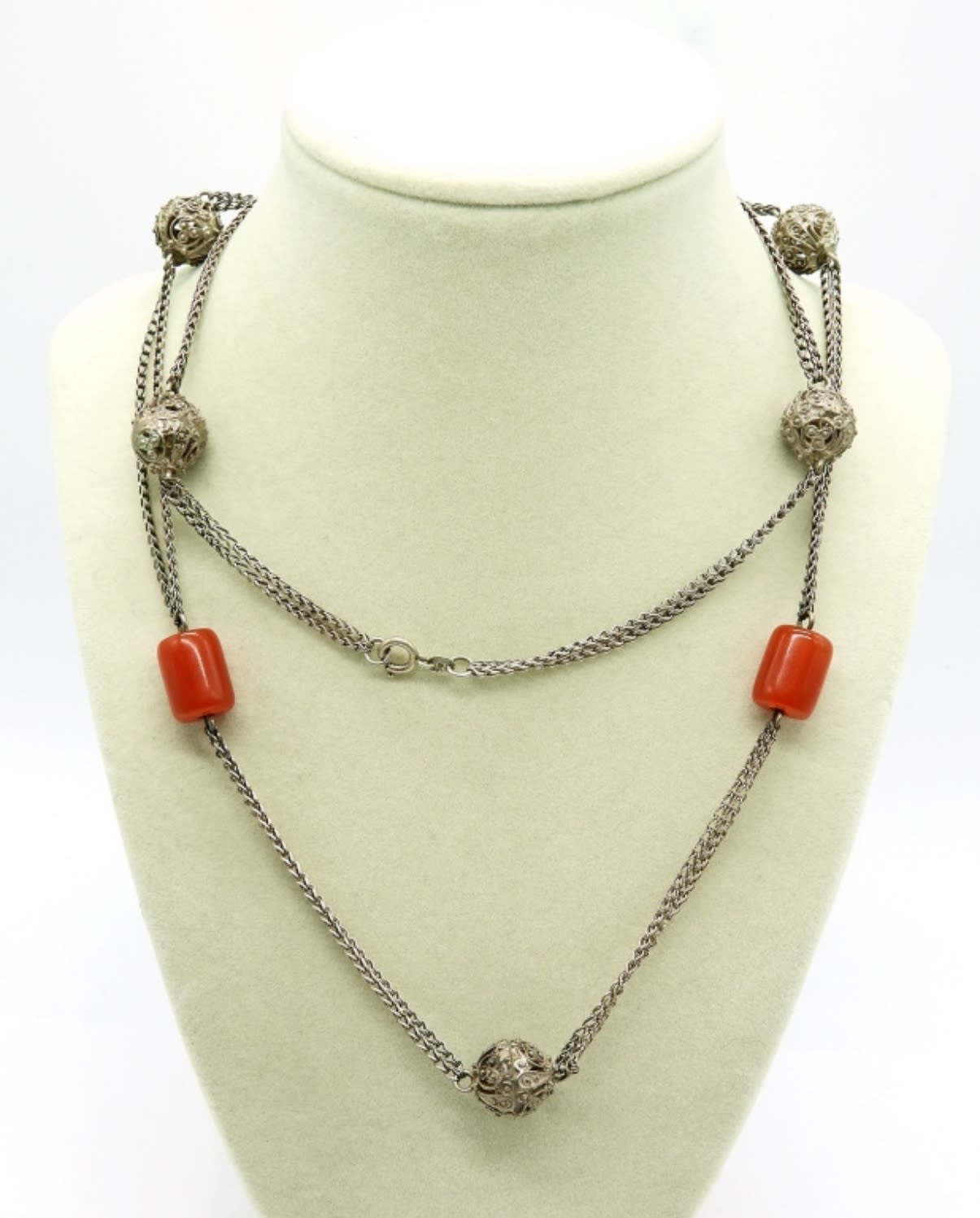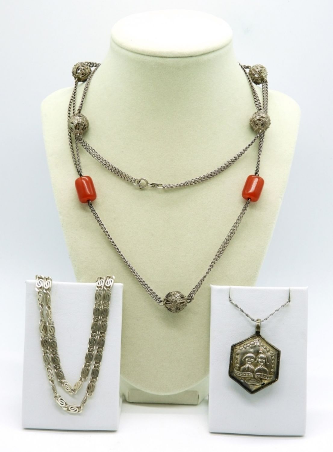 Vintage Max and Moritz Rattle Pendant on a Sterling 15 inch chain. Pendant Stamped 800. 22 inch Sterling Chain and a vintage sterling 30 inch Necklace with Red Beads and Sterling Ornate Balls. 47.1 DWT