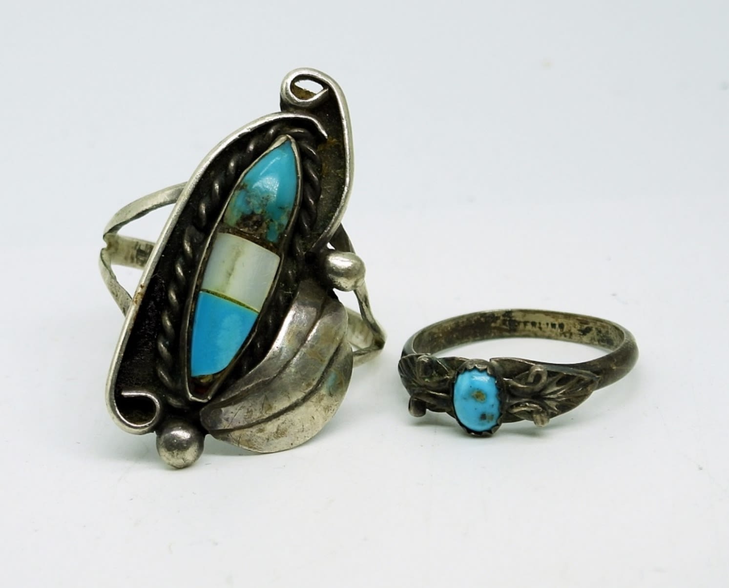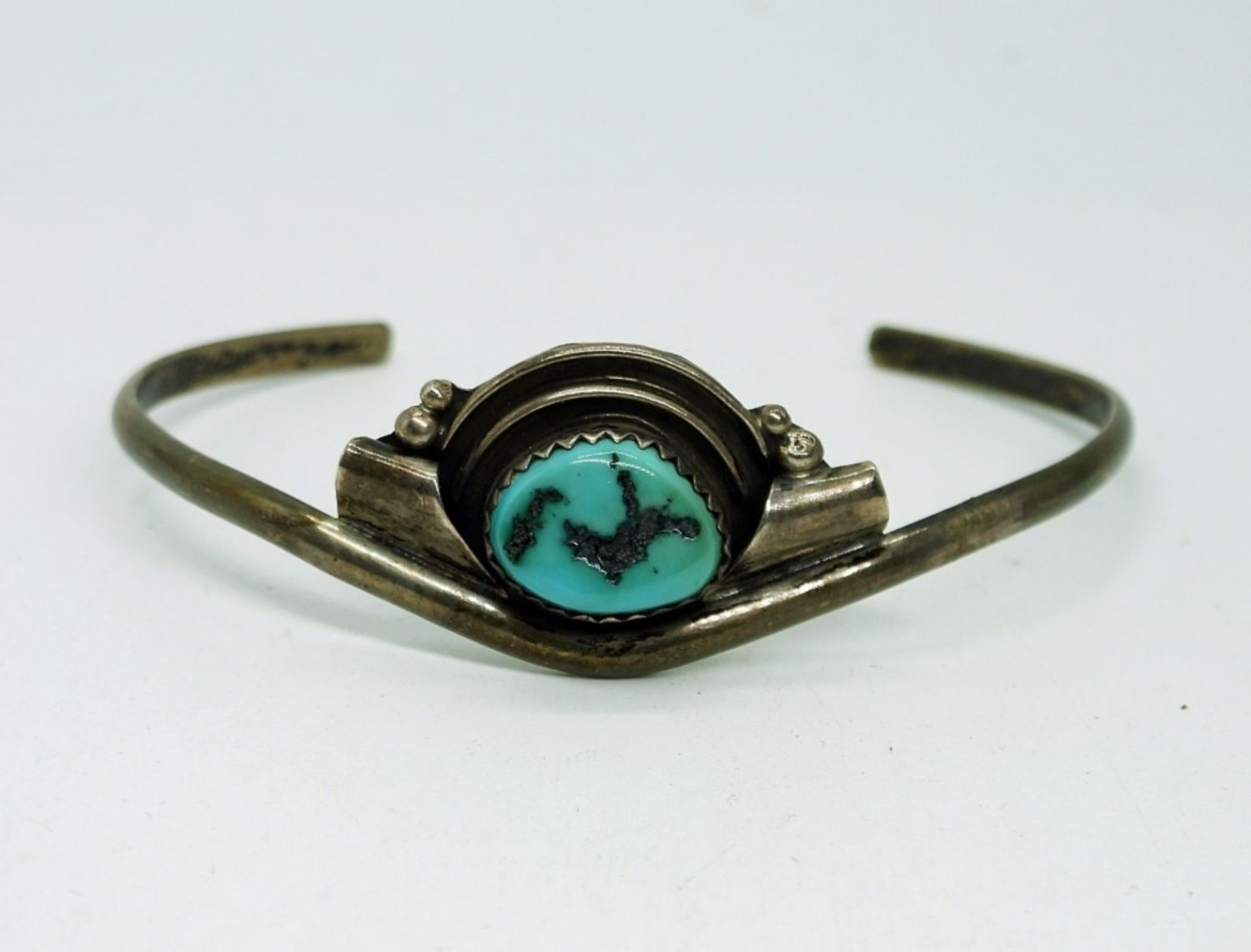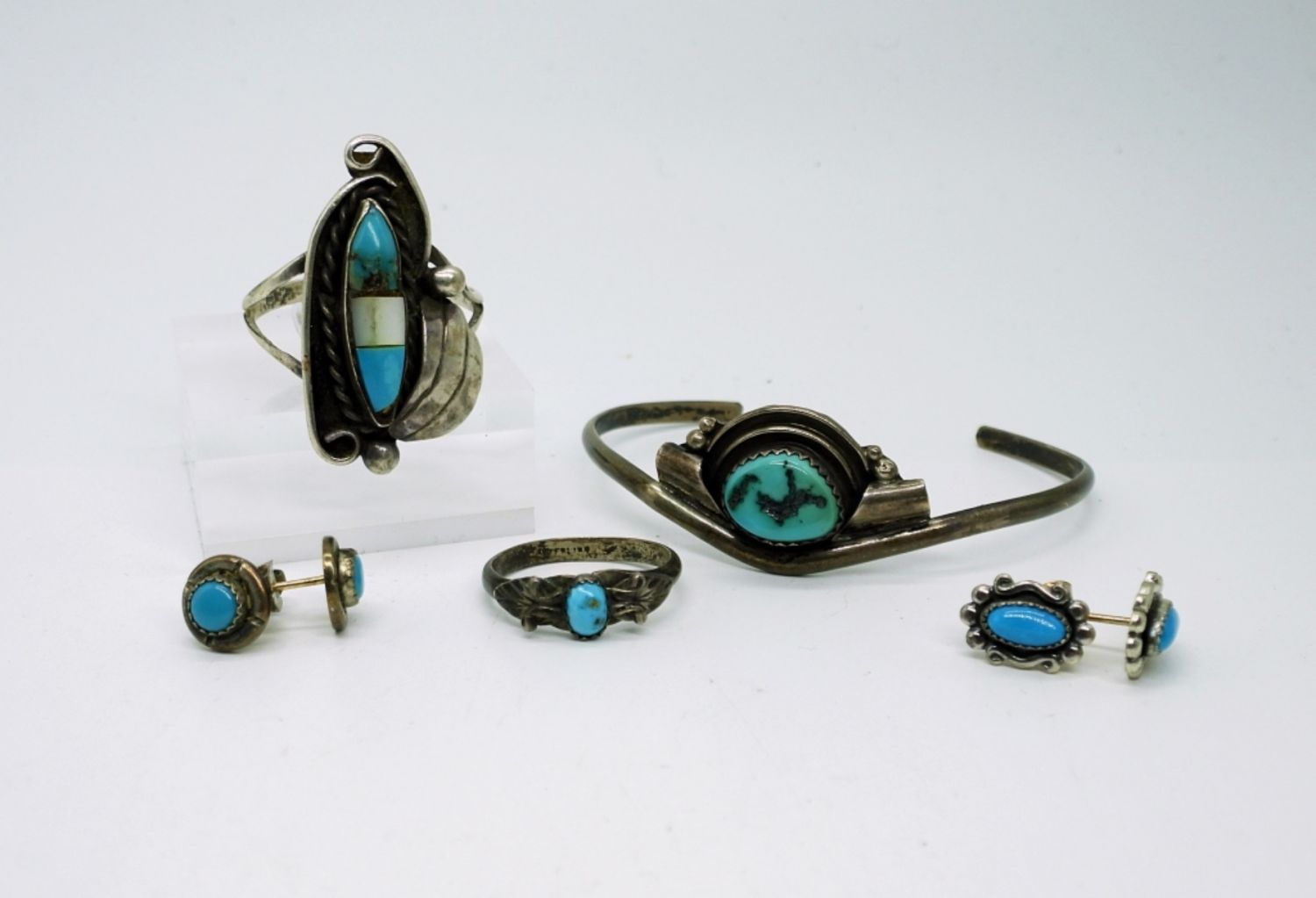 Navajo Style Sterling Silver Turquoise Bracelet, 5″. Two Sterling Turquoise Rings, Sizes 7 & 11. Two pair of sterling turquoise pierced stud earrings. (12.9 DWT)