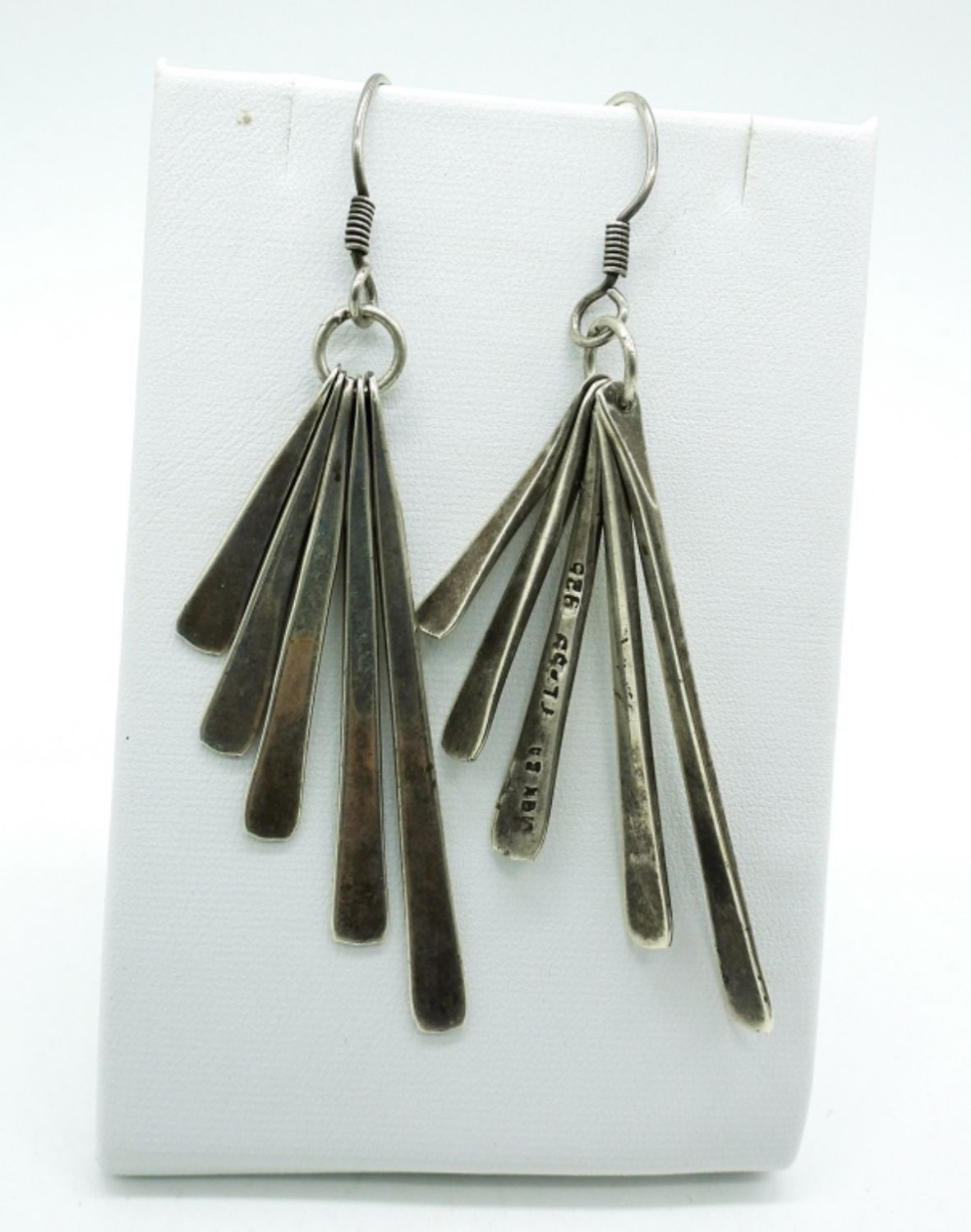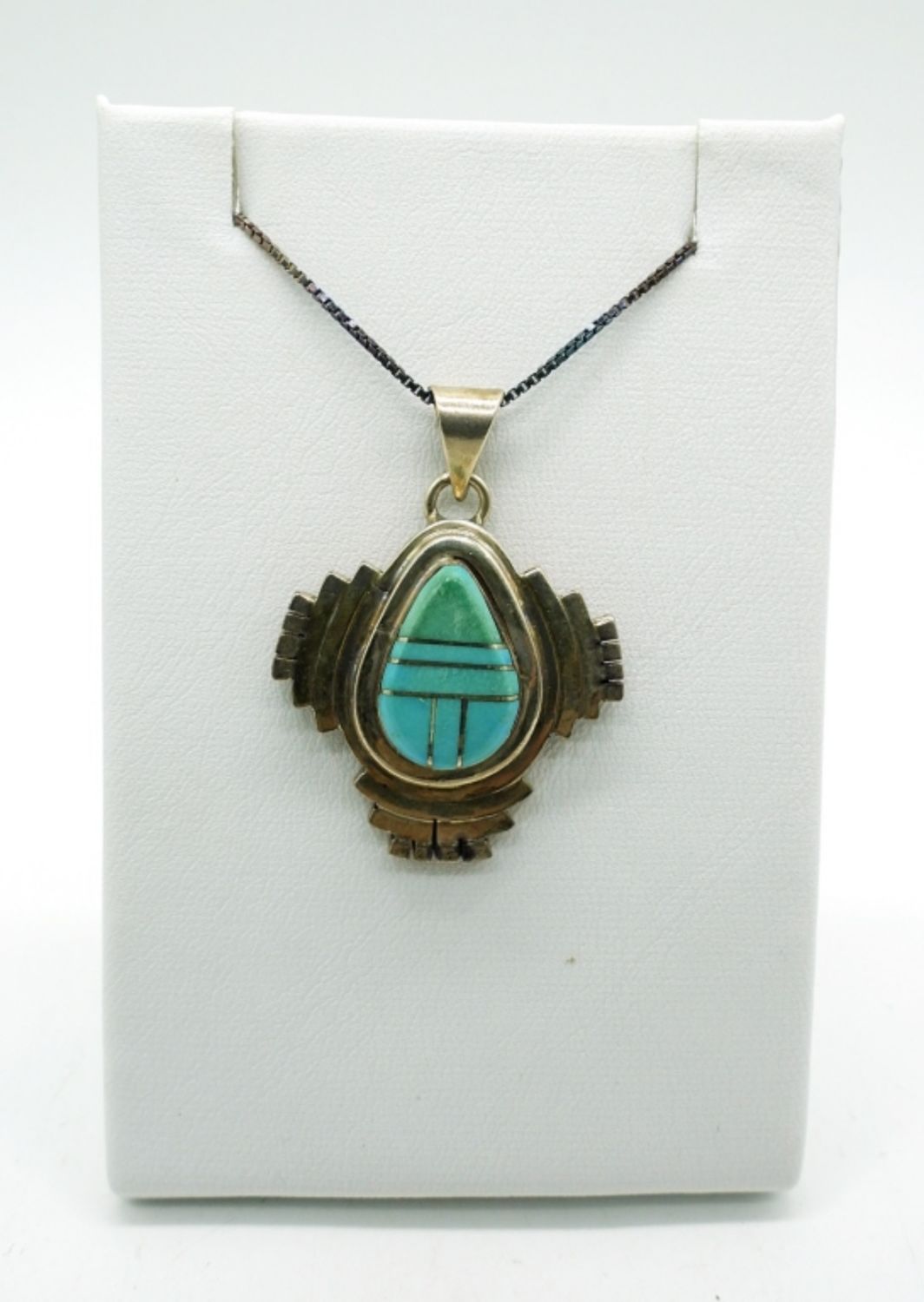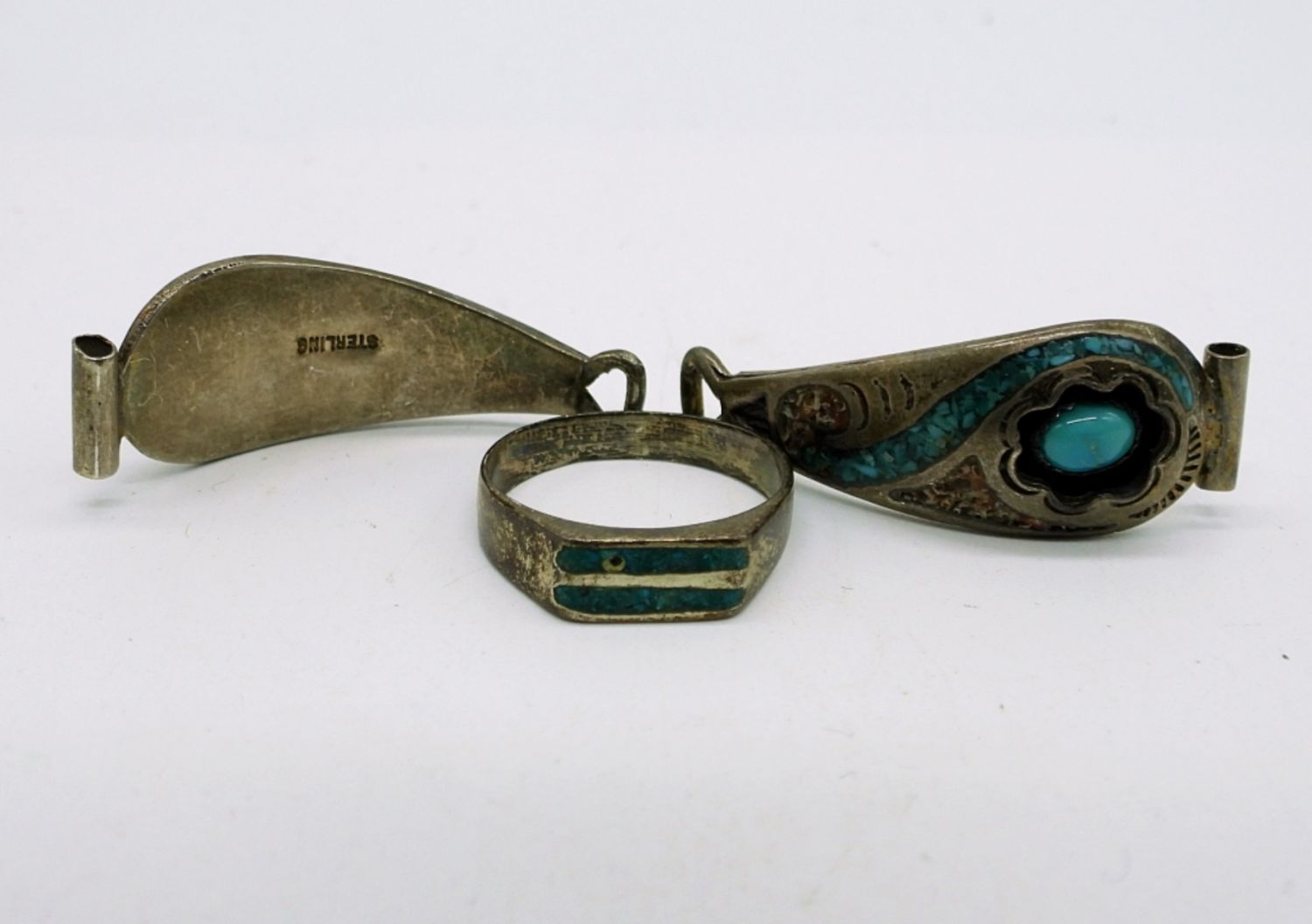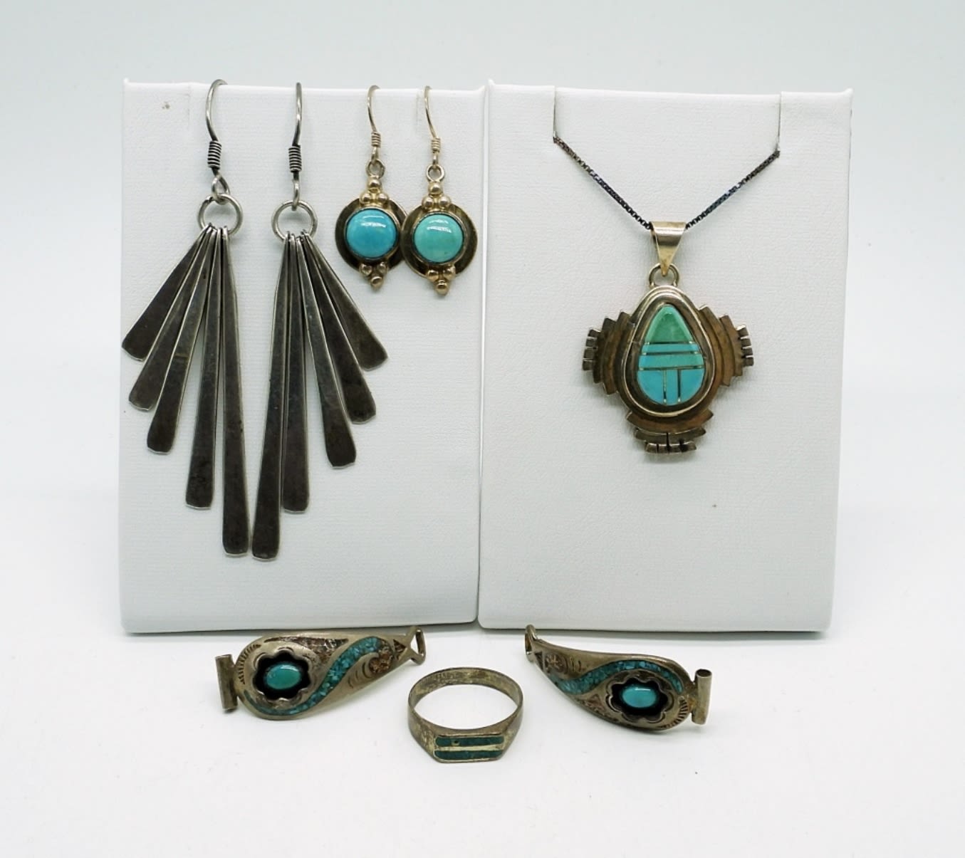 Sterling Silver, Stamped Mexico. Necklace with pendant 18″. Two pair of sterling dangling earrings, Ring Size 5.5. Sterling & Turquoise Watch Band Ends (1 1/4″ x 1/4″). (25 DWT)