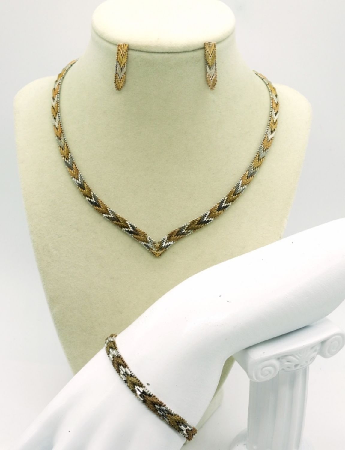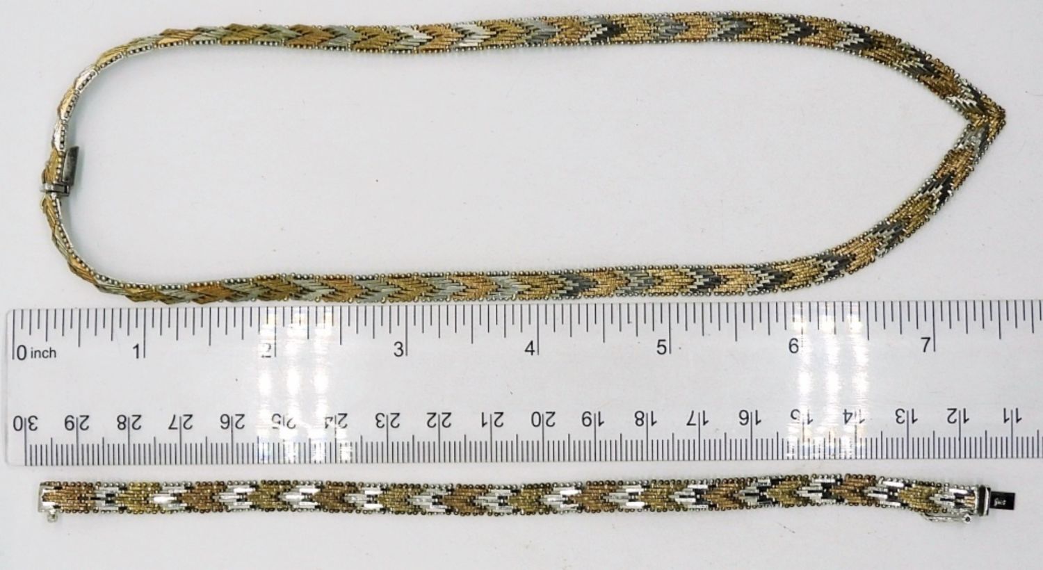 Stamped “925 Italy”, Chevron Necklace in Gold tone/ Rose Gold Tone & Silver 16″. Bracelet is 7″ and the Earrings are 1″ long. (31.4 DWT)