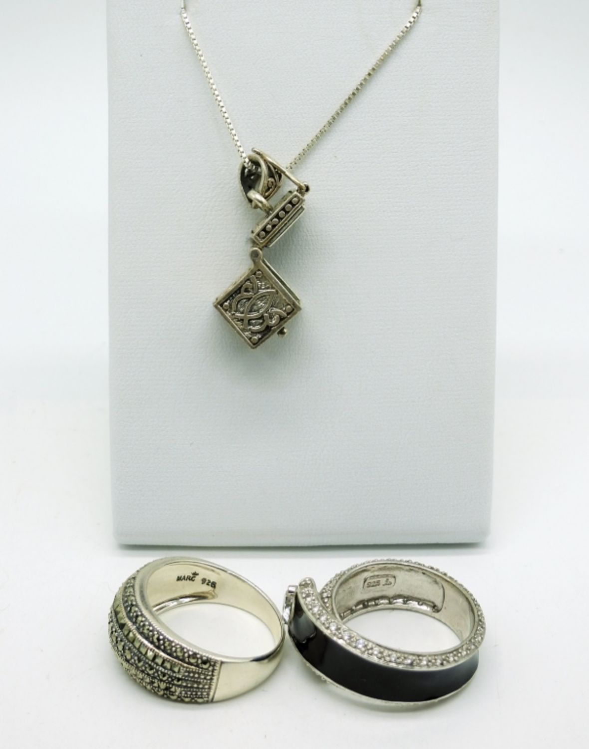 Sterling Silver Flower Etched Bracelet, 5″. Two Rings, Marcasite & Black Enameled with White Gemstones Size 10. Little box charm that opens on an 18″ sterling chain. (21.8 DWT)