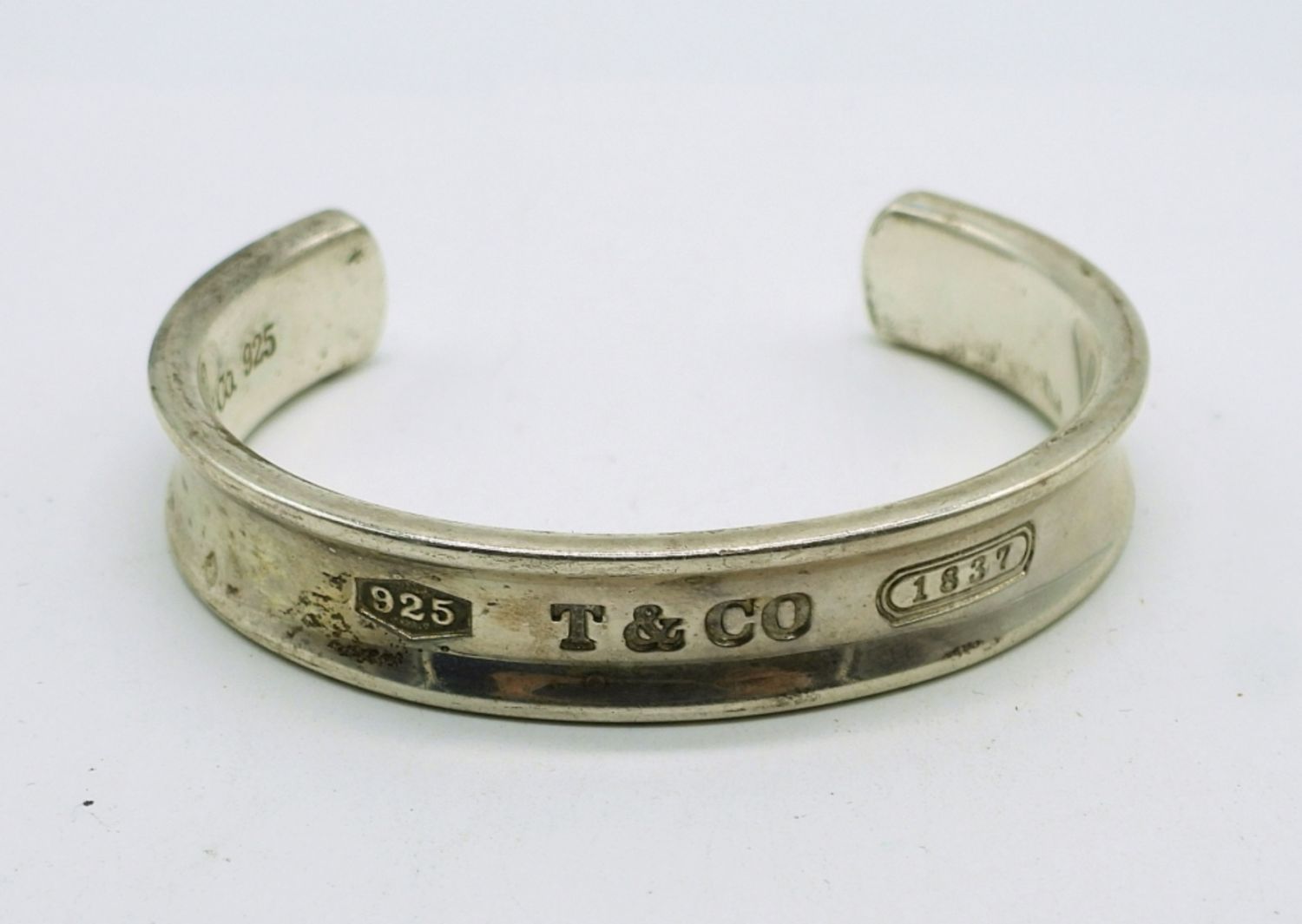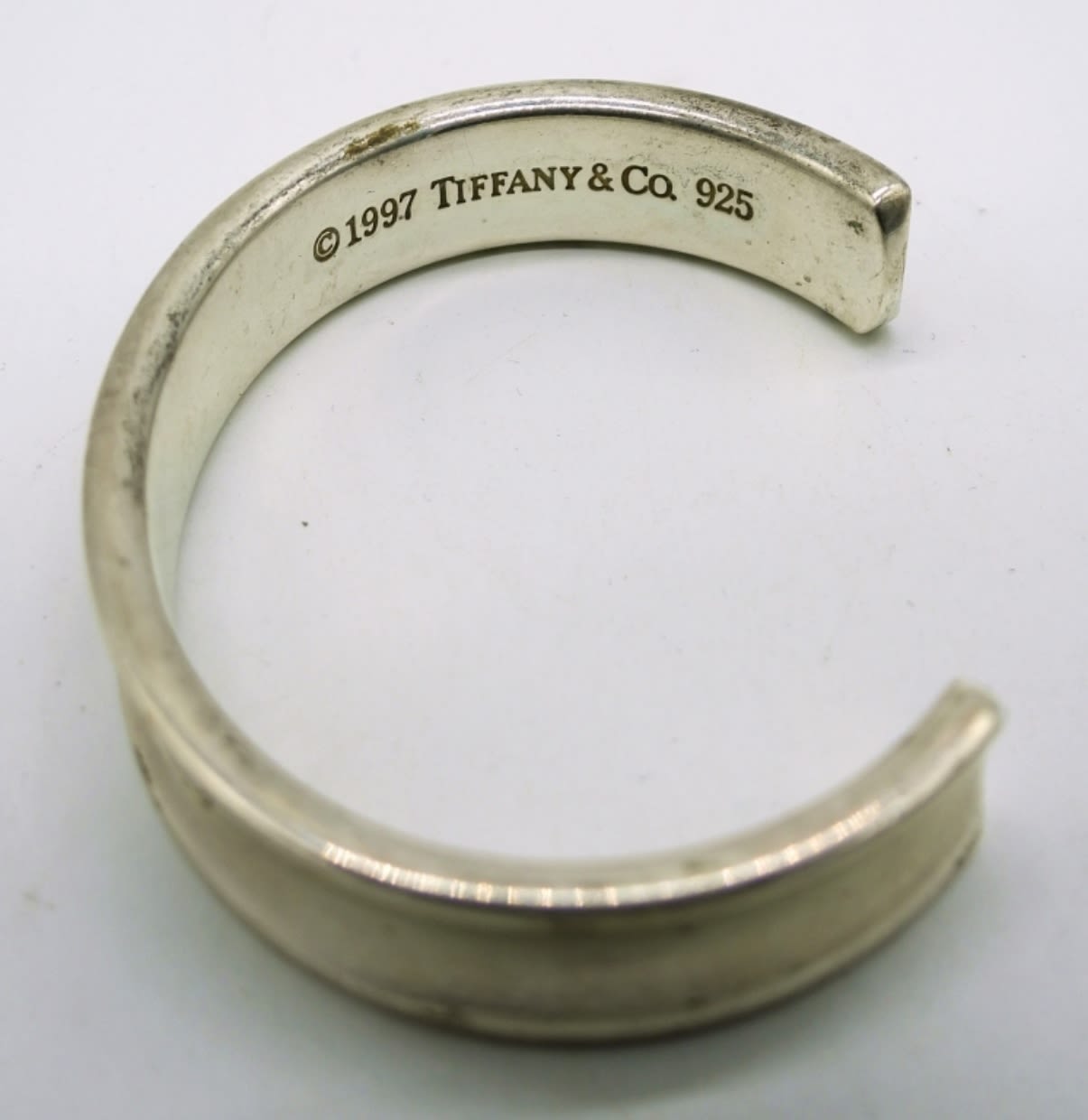 Sterling Silver Tiffany & Co. 1837 cuff bracelet featuring the signature design of when Tiffany was founded. Width 11mm. Measures 2.5″ in diameter. Marked “1997 Tiffany & Co. 925”. (26.3 DWT)