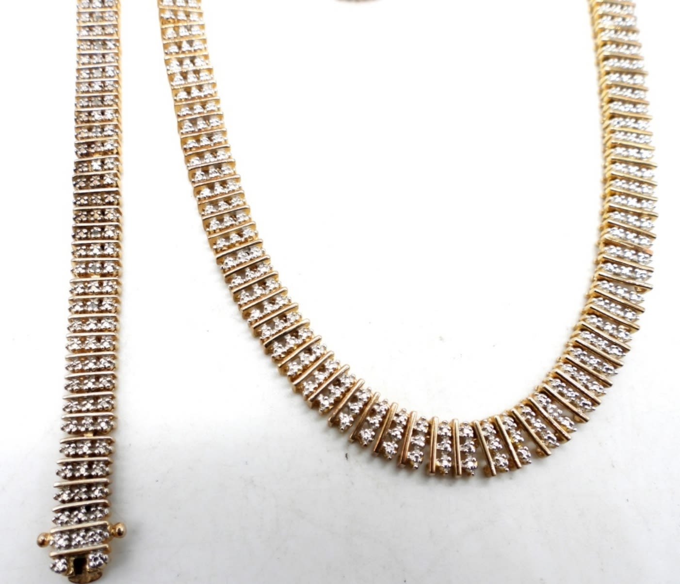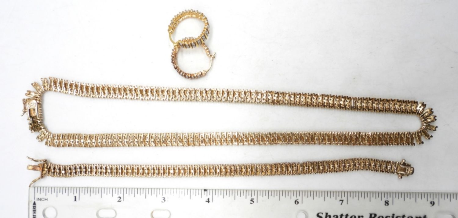45DWT, CLEAR STONES ALL LONG EACH, 18 1/2″ LONG NECKLACE AND 8 1/2″LONG BRACELET, PIERCED MATCHING EARRINGS ALL STAMPED 925 CHINA