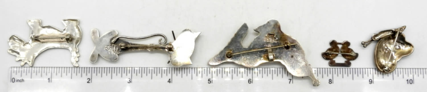28.4DWT, 1- CAT 2 1/2″ STAMPED MEXICO TAXCO 925, 1- SEAL 2 1/2″ LONG STAMPED TS-01 925, 1-MARCASITE BUTTERFLY STAMPED STERLING,1″ LONG, 1- DOG 2IN” LONG STAMPED STER, 1- BABY CHICKS STAMPED STERLING DOSKOW