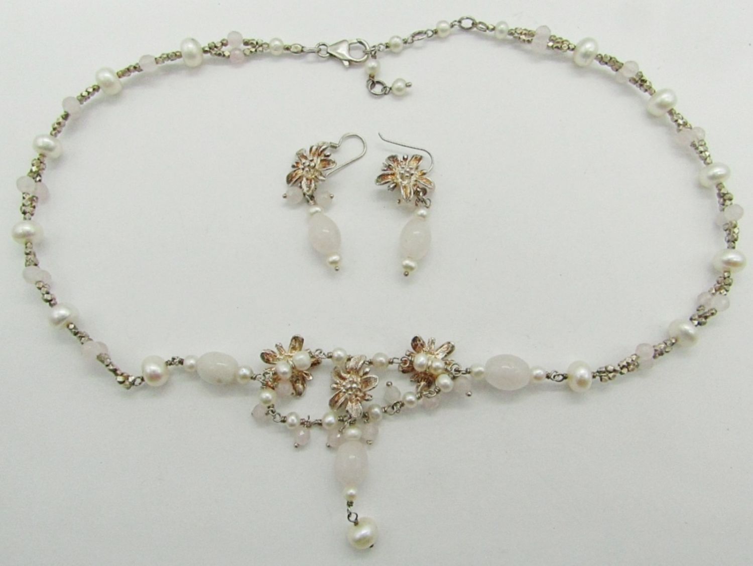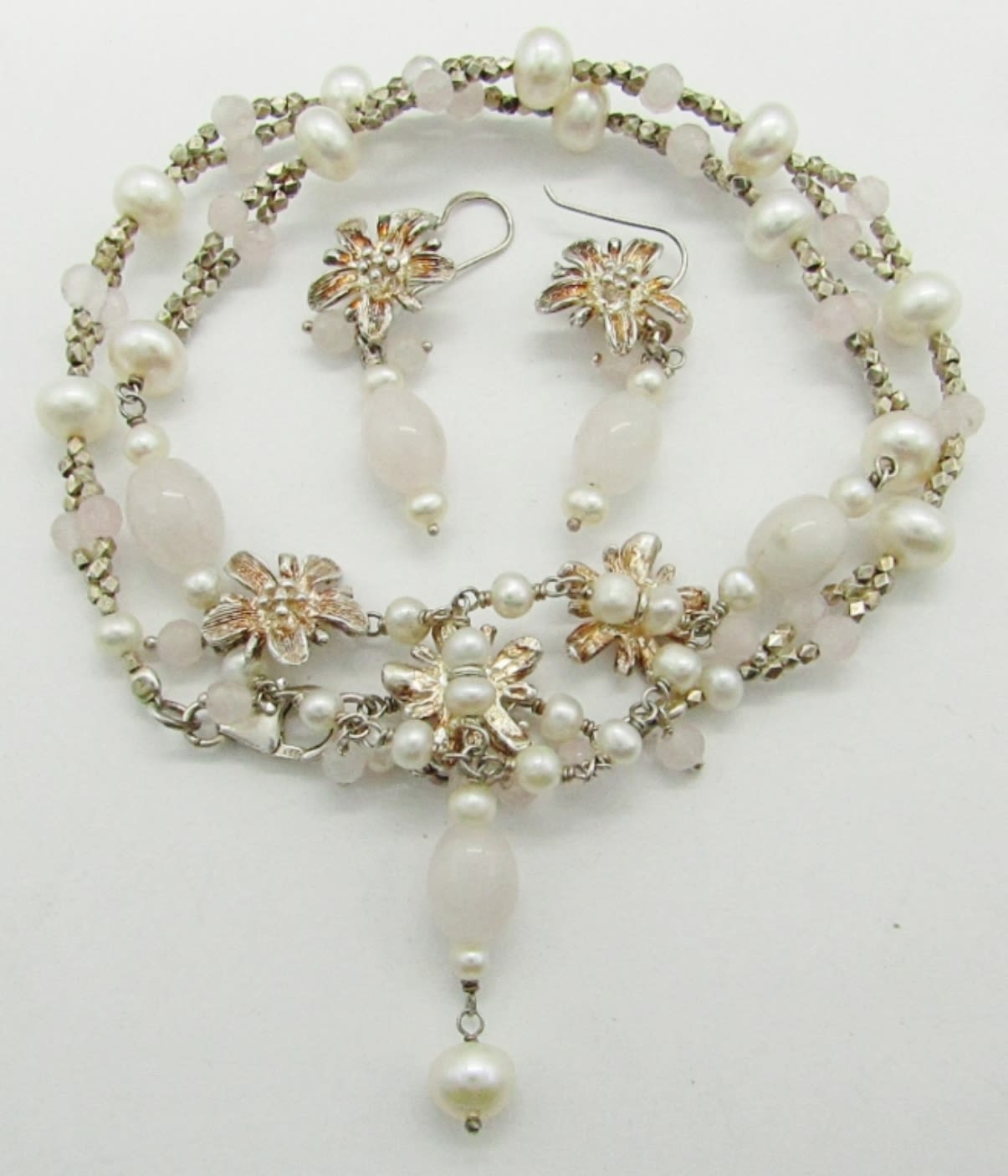 18″ Clear Quartz, Pearlescent, & Silver Necklace & 1.25″ Matching Drop Pierced Earrings; Marked 925; 20.9 dwt.