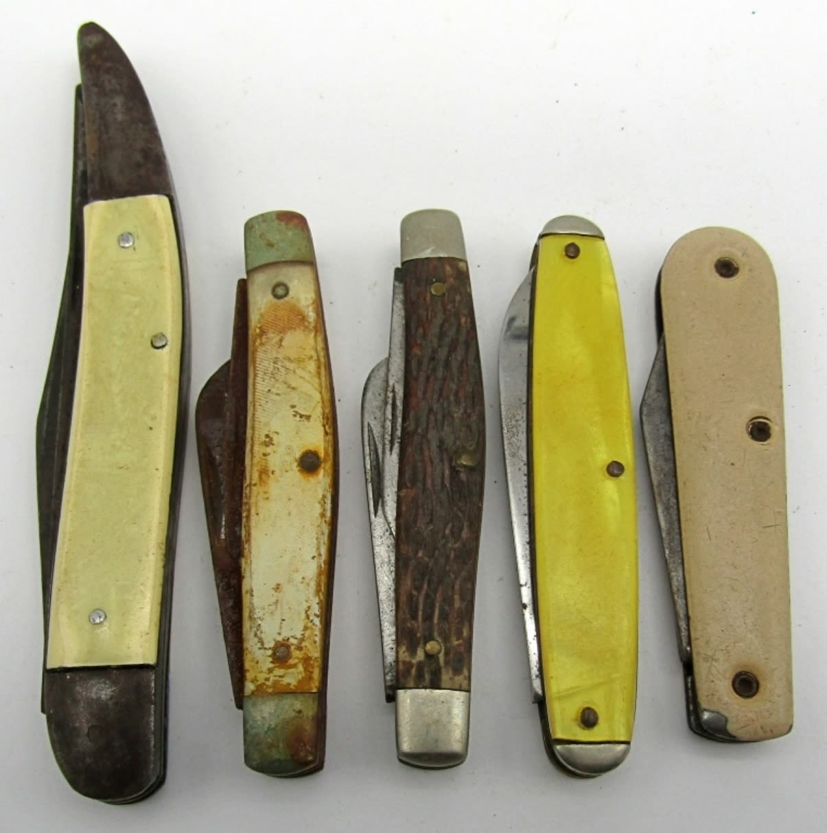 2-Blade Fish Knife, 3-Blade Old Timer Schrade USA, 2-Blade USA, 2-Blade Kent NY City, 3-Blade Schrade Walden NY USA; Used Conditions.