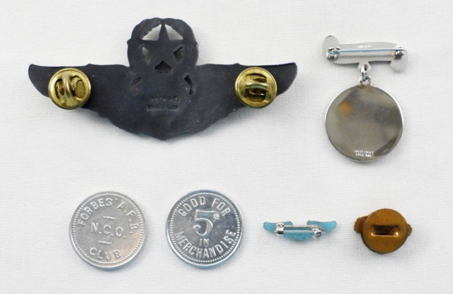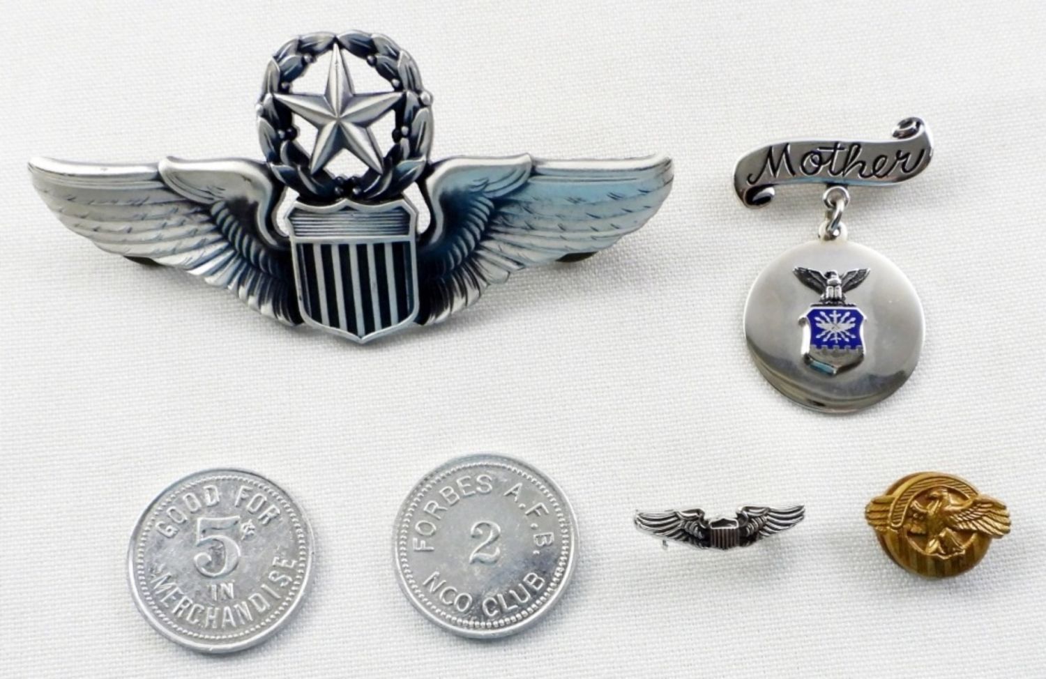 MOTHER USAF PIN, MINI WING PIN, EAGLE COLLAR BUTTON, (2) FORBES A.F.B. CLUB COINS
