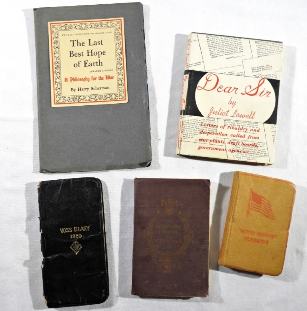 TESTAMENT, SPIRITUAL ALMANAC FOR SERVICEMEN, THE LAST BEST HOPE OF EARTH, DEAR SIR by JULIET LOWELL & VOSS DIARY 1920