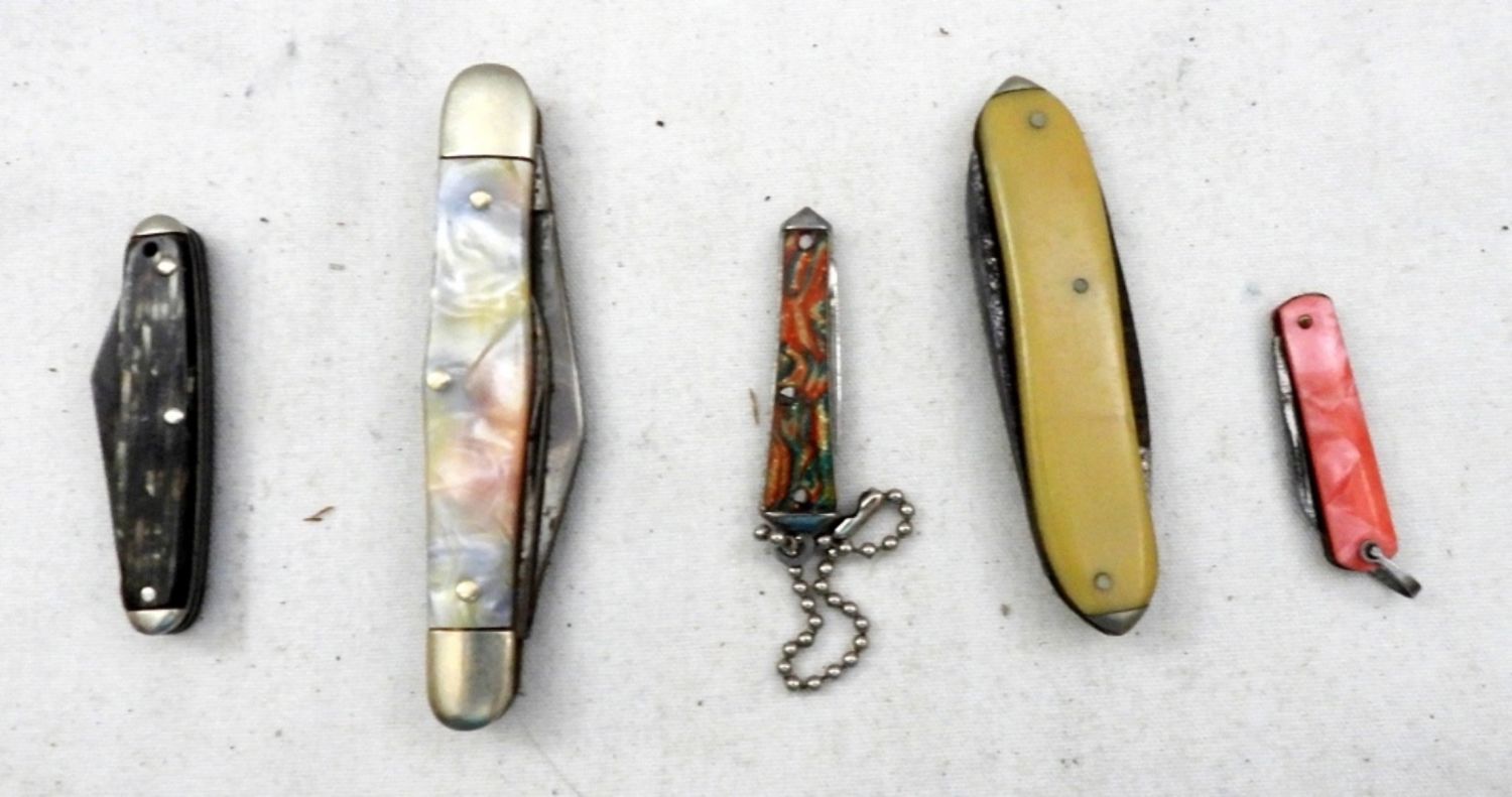 3-Blade Solingen Germany Hen & Rooster 2000, 2-Blade Utica Cutlery New York, 2-Blade Hammer Brand, Sing Blade Unmarked Keychain, Single Blade Tiny Japan Keychain; Used Conditions.