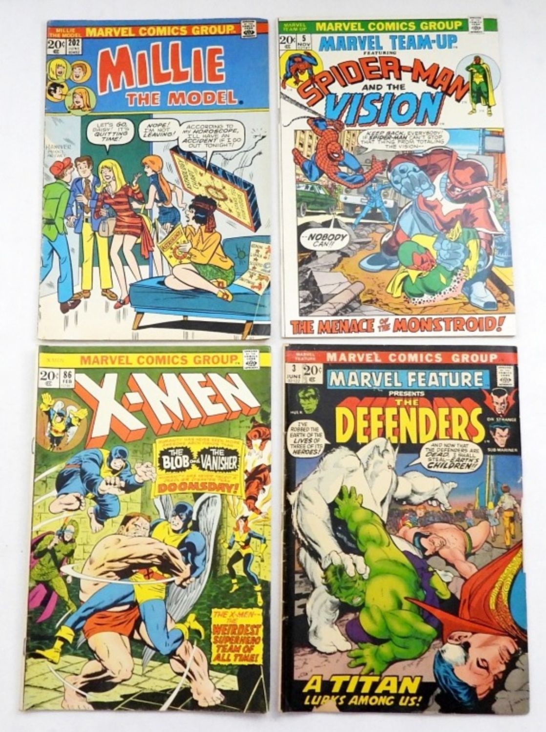#5 MARVEL TEAM-UP SPIDER-MAN and the VISION VF, #86 X-MEN FINE, #3 THE DEFENDERS VG, #202 MILLIE VG