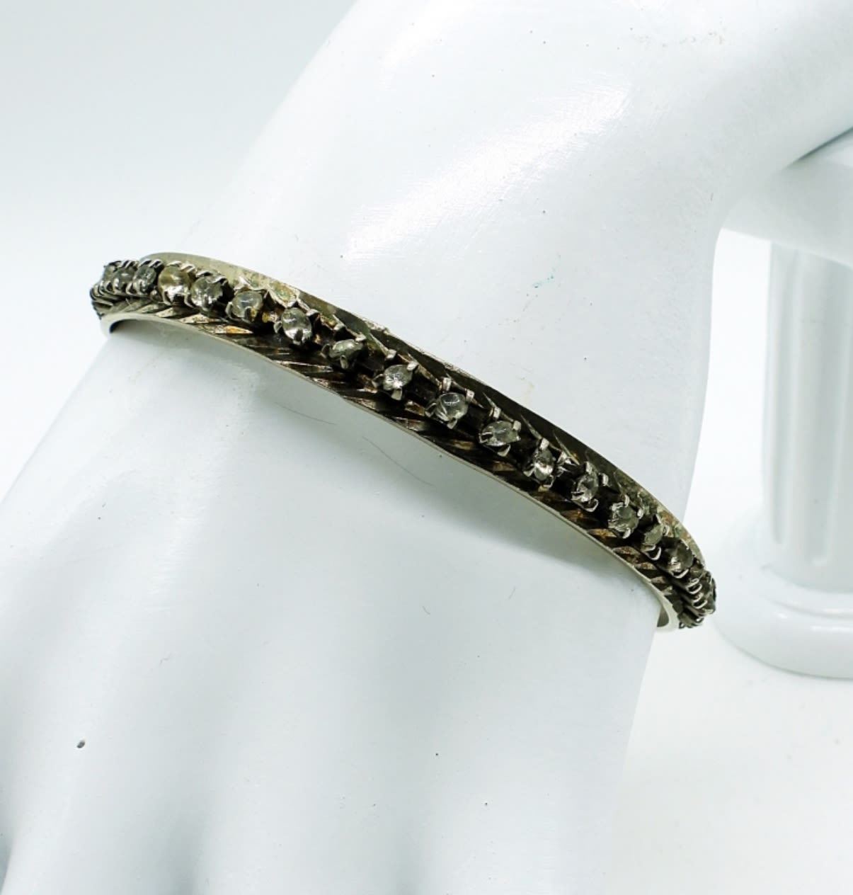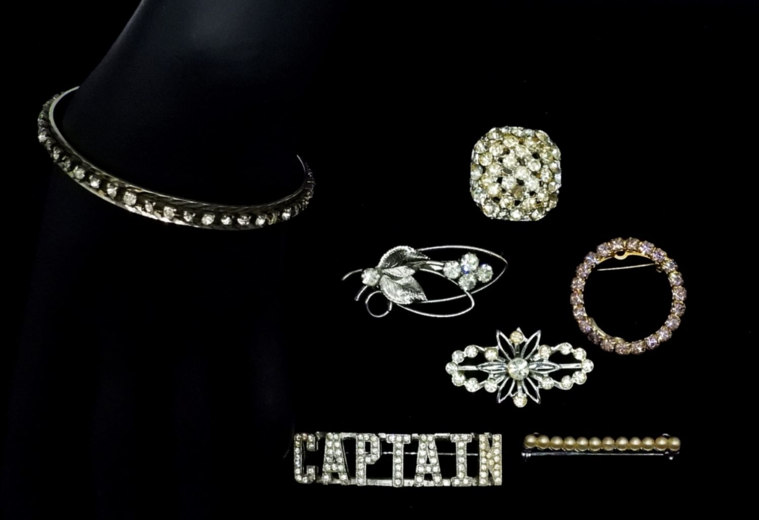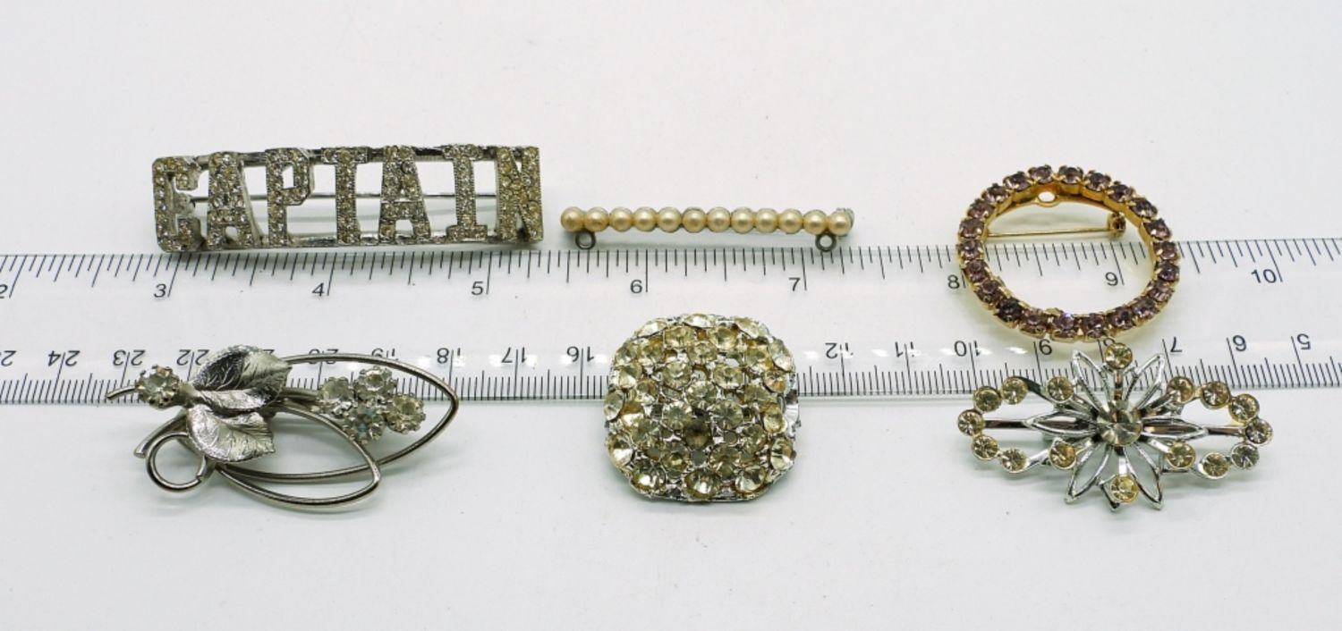 Five Vintage White Rhinestone, Silver Tone Brooches. One Silver Tone Vintage Pearl Pin and a Vintage Silver tone Bangle with White Rhinestones (7″).