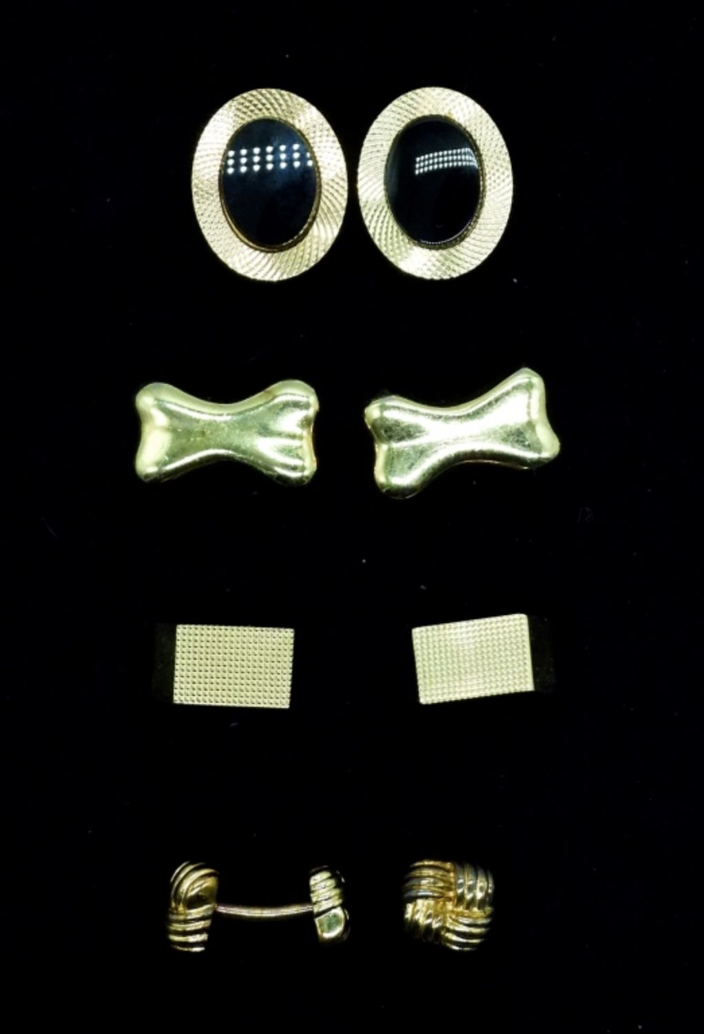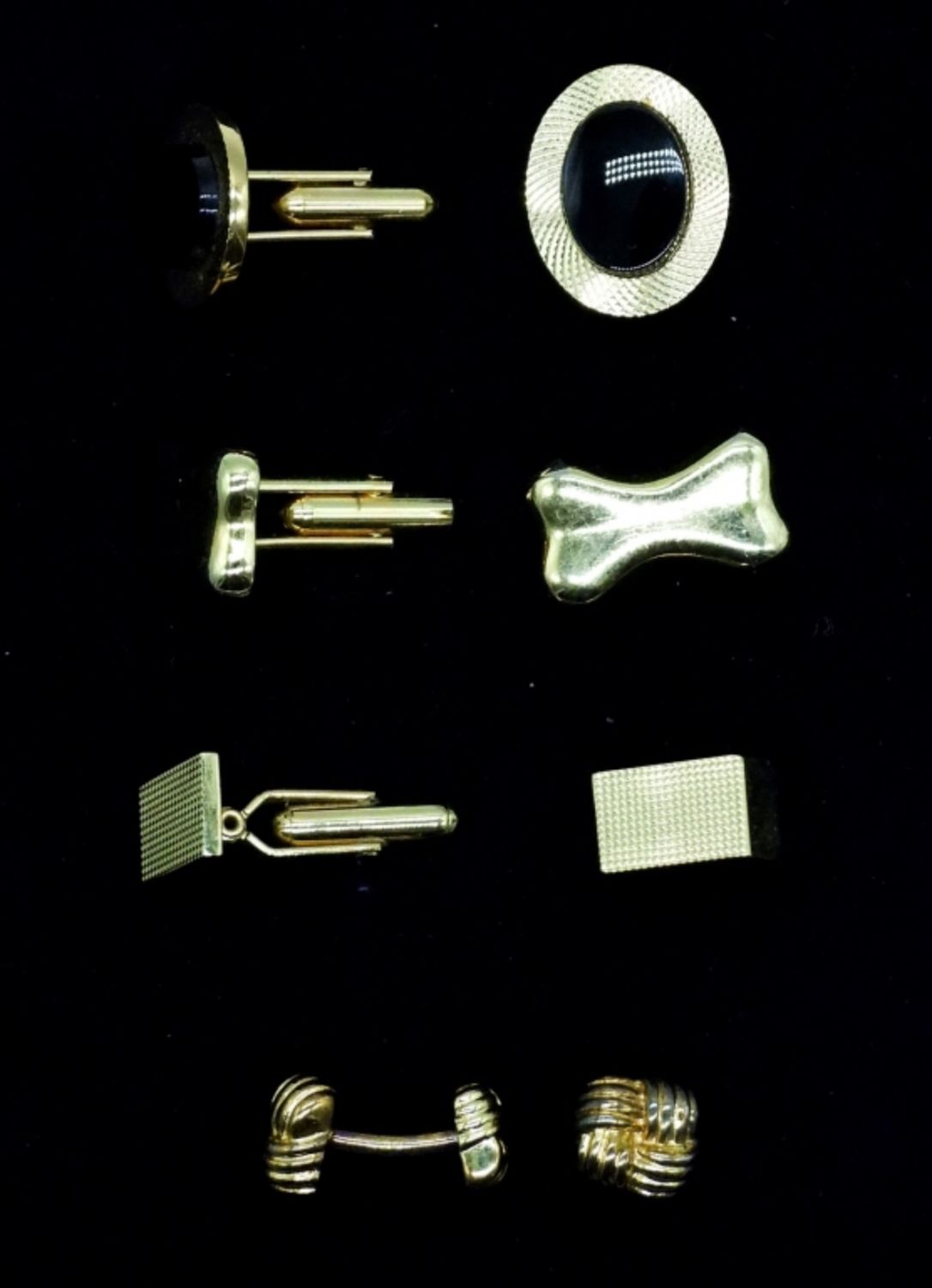 Four sets gold tone cufflinks. Oval with Black Gemstone & Dog Bone measure 3/4″ x 1/2″