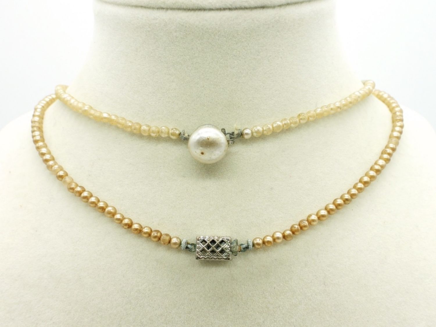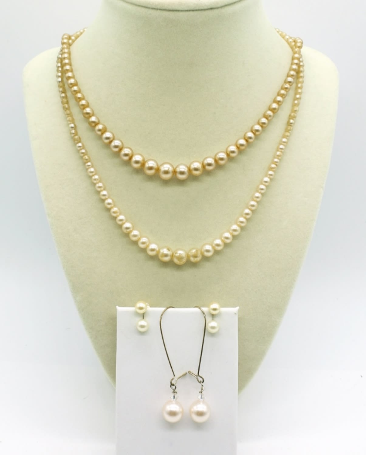 Two Vintage Faux Pearl Necklaces, both 16″ and Three pair of faux pearl earrings, Two pair of studs and one pair of pink toned dangling pearls.